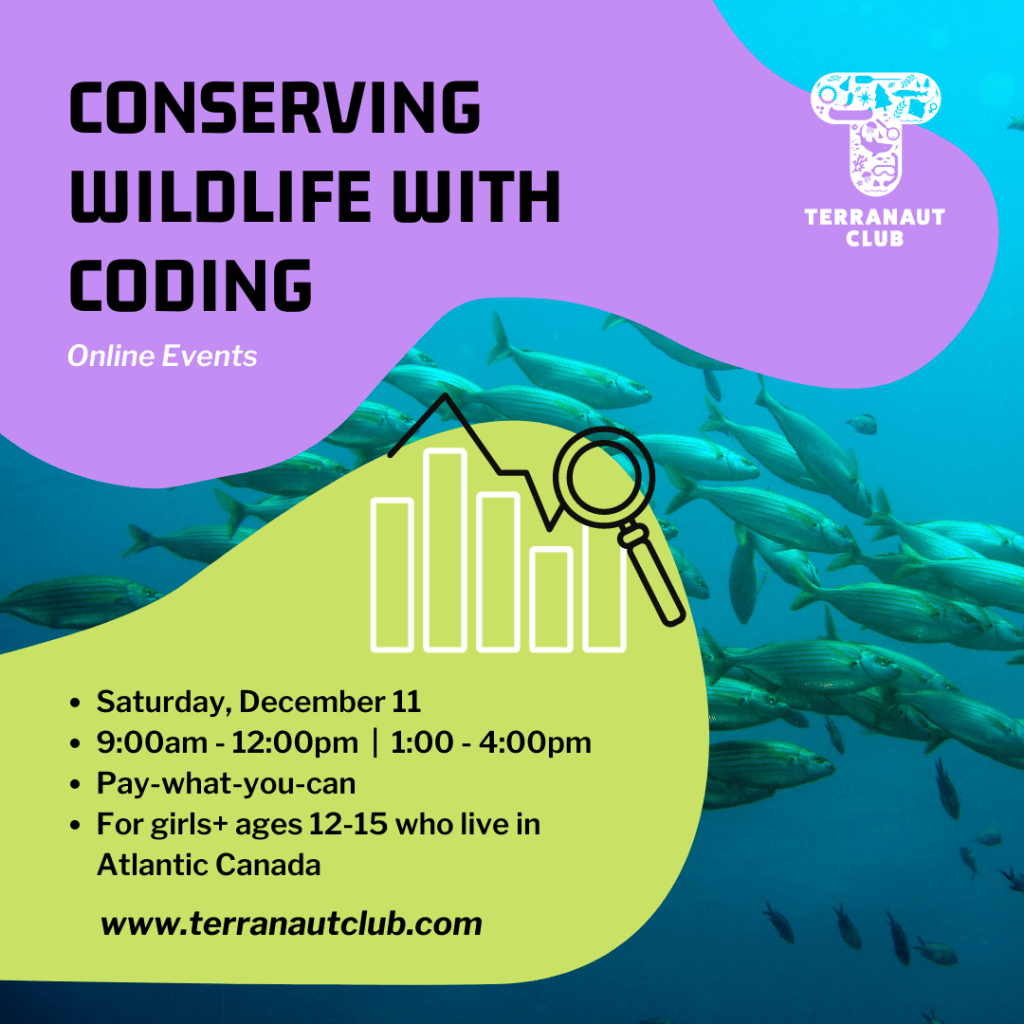 Join us this fall for our online, pay-what-you-can, wildlife-based coding workshops! Our Terranaut Club President and resident coding expert Danielle Quinn will lead participants through exciting data science and coding activities related to real topics in marine biology and wildlife conservation.
