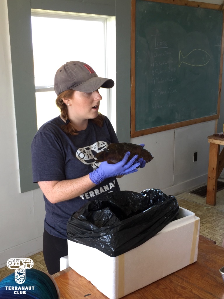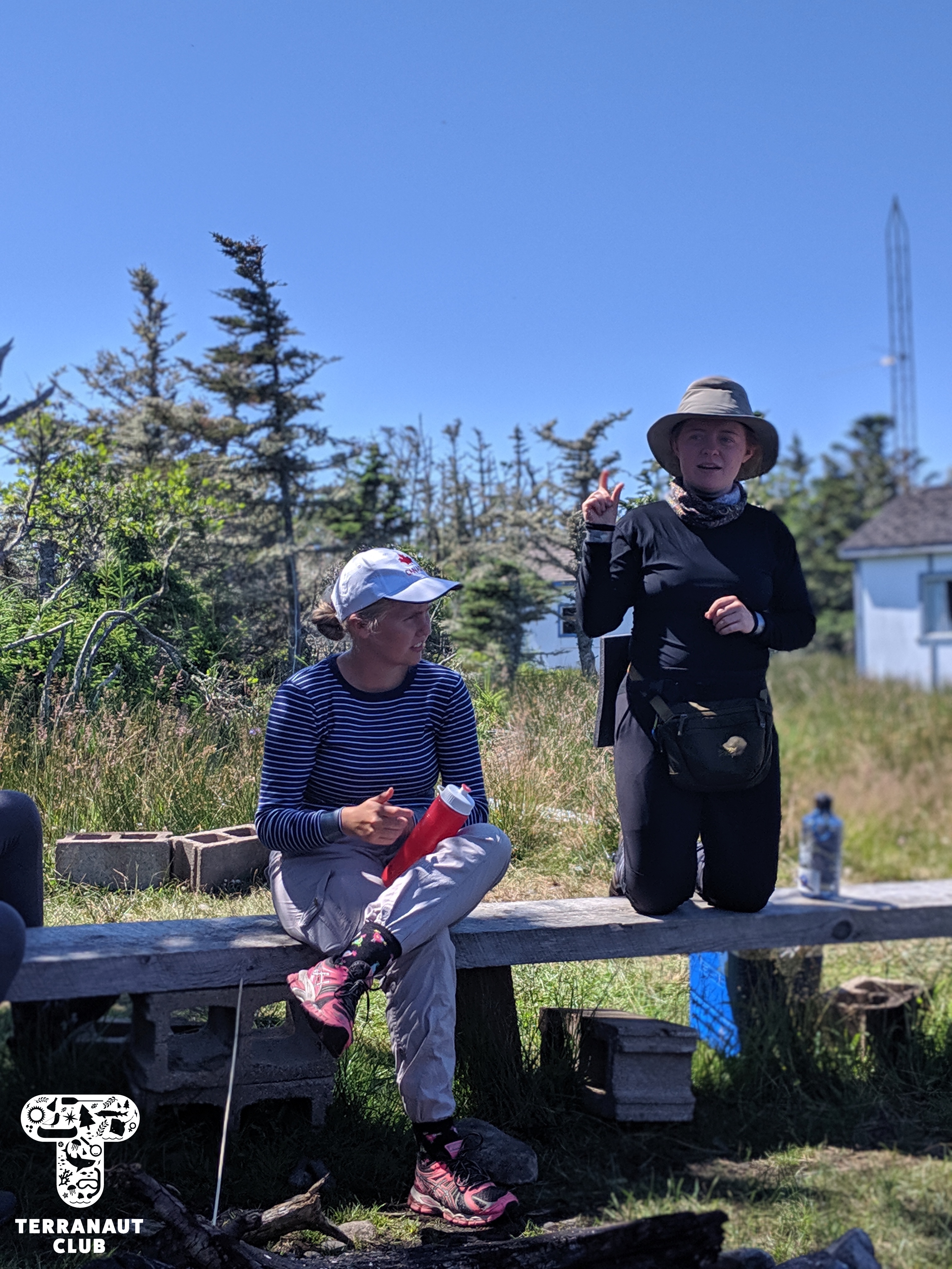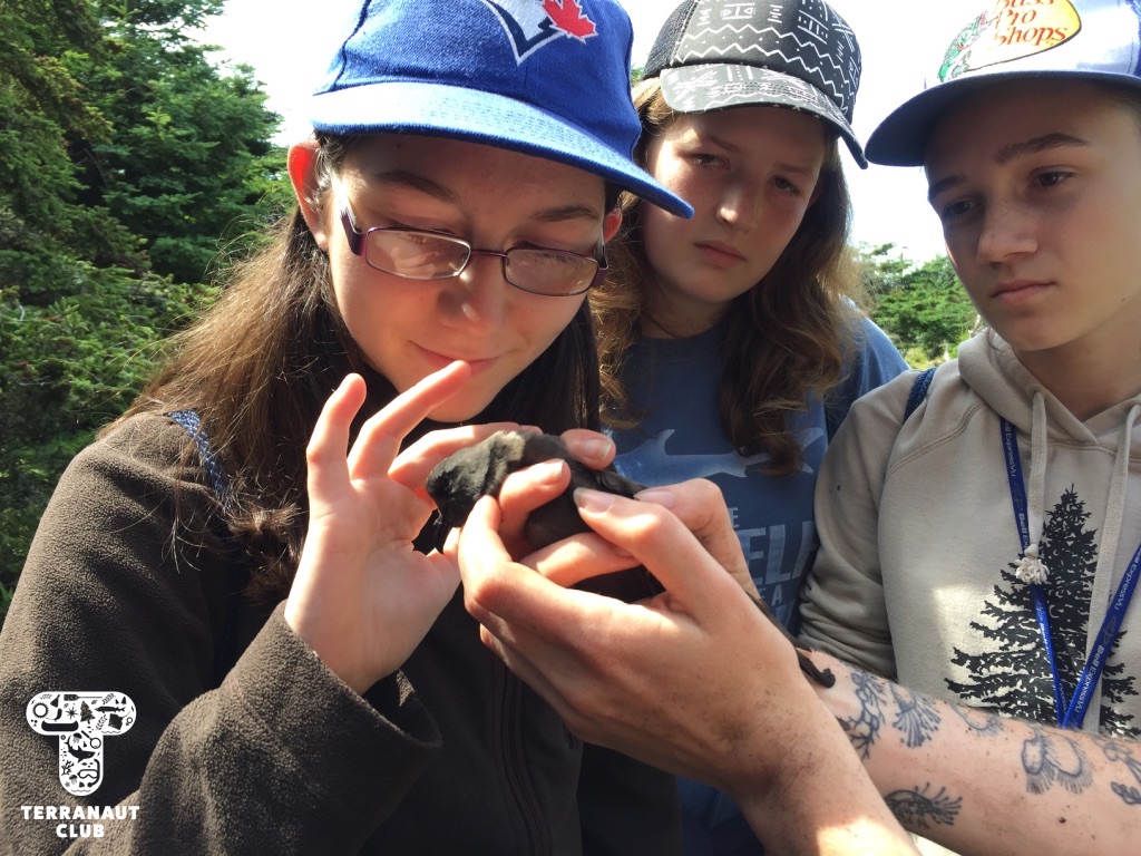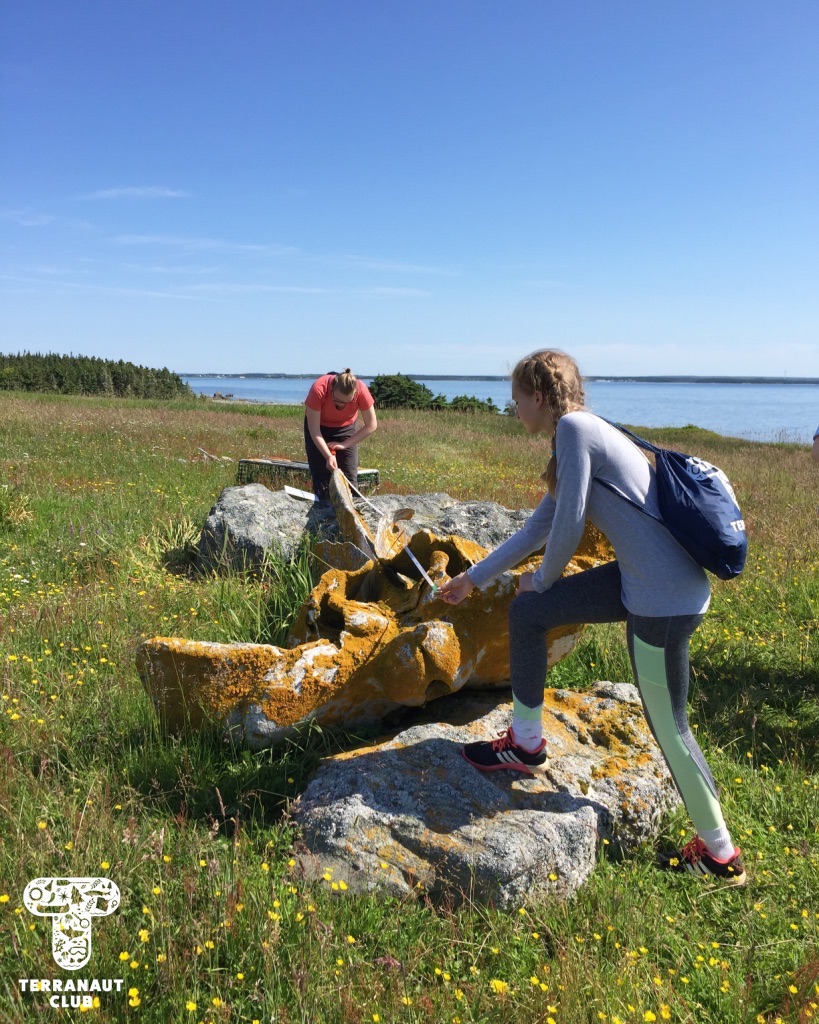 On day 2, our girls got to work in teams to identify the Island’s mysterious washed-up whale bones (later identified as a Humpback whale), do a dissection of invasive small-mouth bass caught in the Lunenburg area to see what the fish had been eating, and go grubbing for Leach’s storm petrels with Instructor Danielle. We were fortunate to find 2 adult petrels that all of our participants got to see, and it gave them a great refresher before assisting Island Biologist Rielle (from Acadia University) with her Leach’s storm petrel research the next day. During this research on day 3, our participants got to watch Rielle, with assistants Safyah and Nina, grub for petrels in designated nests. “Grubbing” involves reaching your arm down a nest in the ground to find and gently remove the adult bird, egg, or chick, for research purposes. Rielle was grubbing these specific nests to try and find the birds that they had attached GPS tags to about 3 weeks earlier. These tags track foraging trips (which can be several hundreds of kilometres!), but the GPS data collected has to be physically downloaded from the tag, meaning we don’t learn anything until the birds are found again and the tags removed. After finding 3 of the 8 birds they were looking for and removing their tags, Rielle and assistants also collected a sample of their blood and feathers. The blood sample will be used to learn about how much mercury the birds are getting from their diet, and the feather sample if they acquired it overwinter. All of these activities we conducted under special scientific research licenses and permits, and the petrels were safely released back into their nests after sampling.