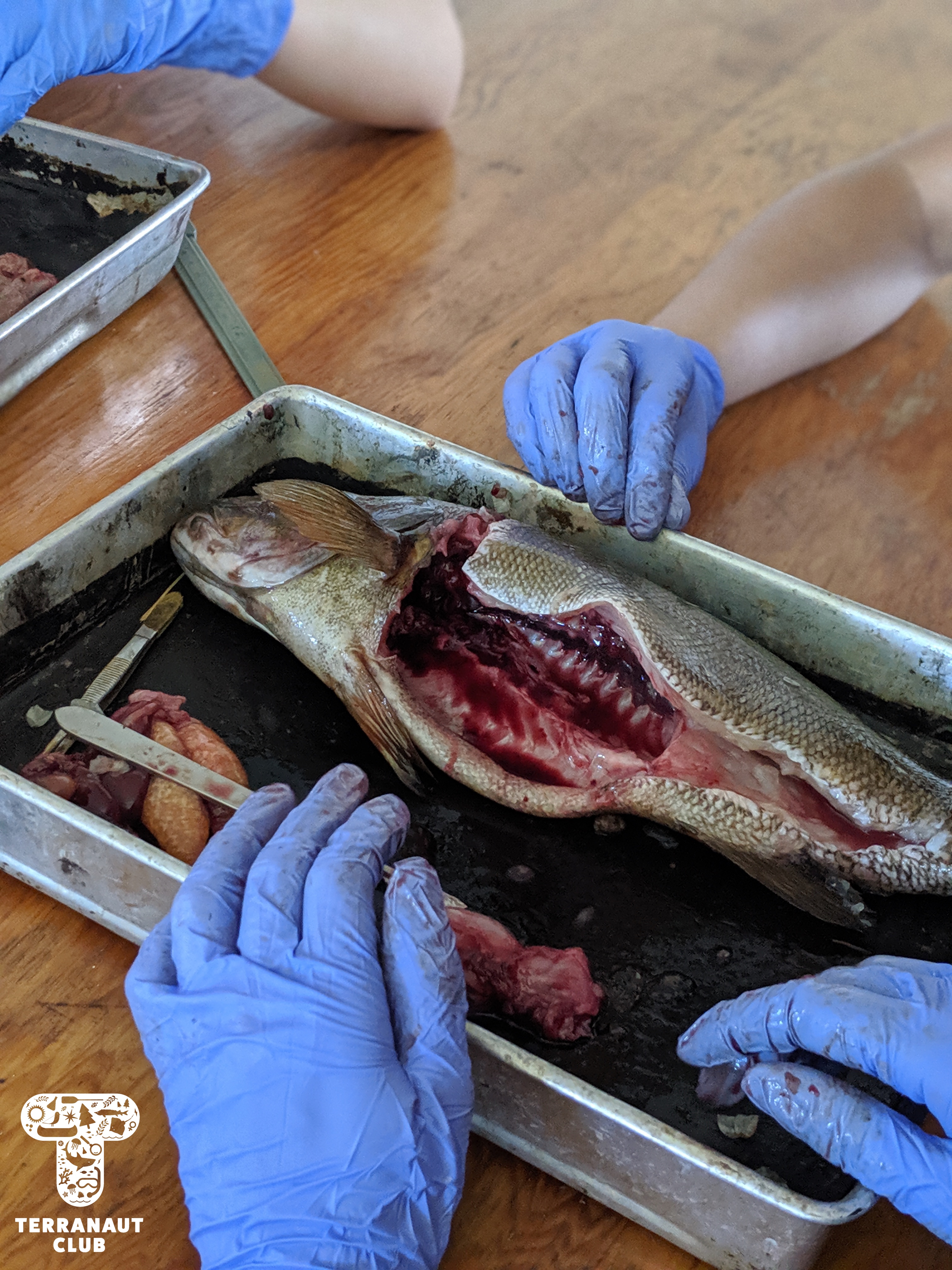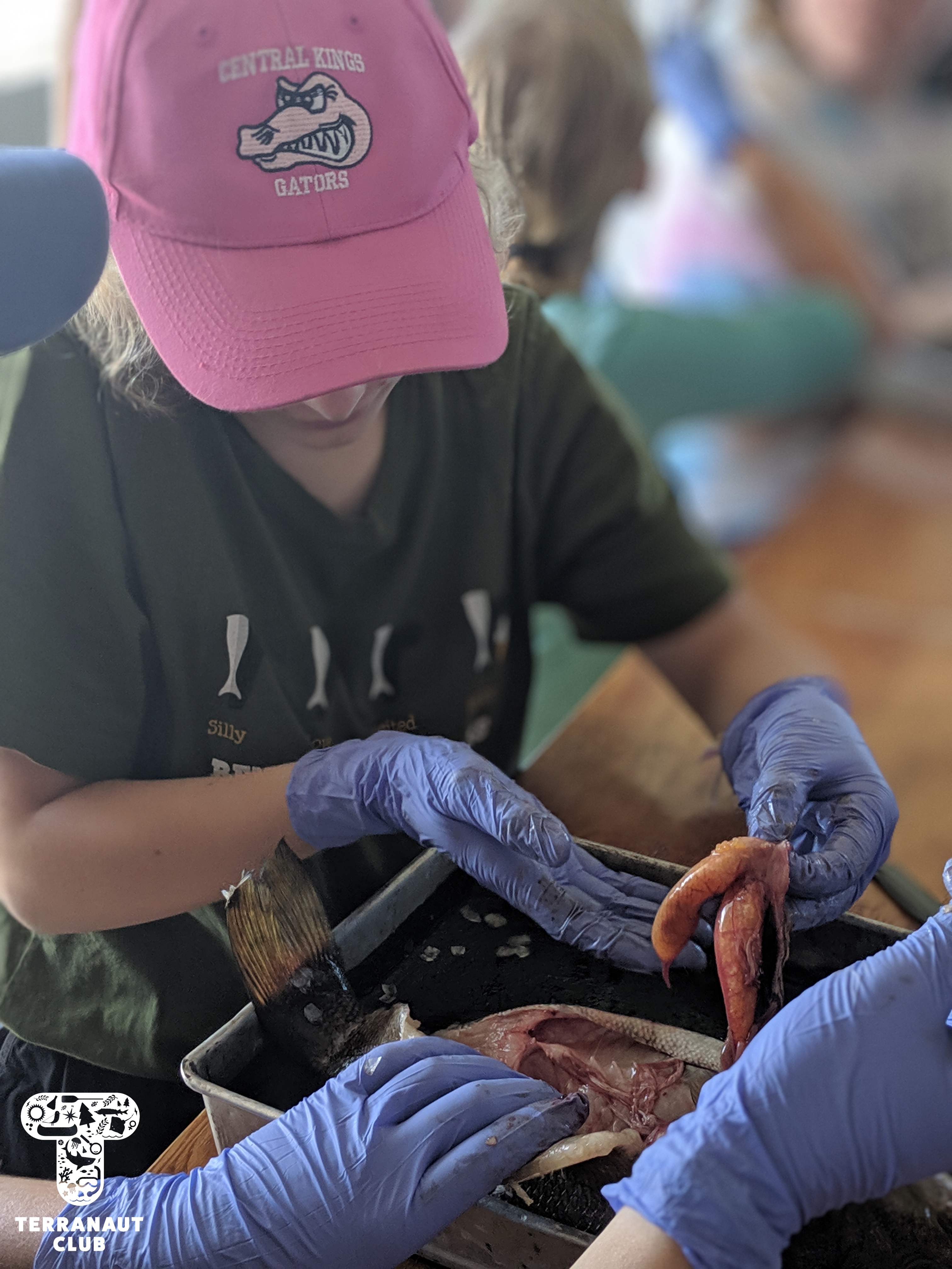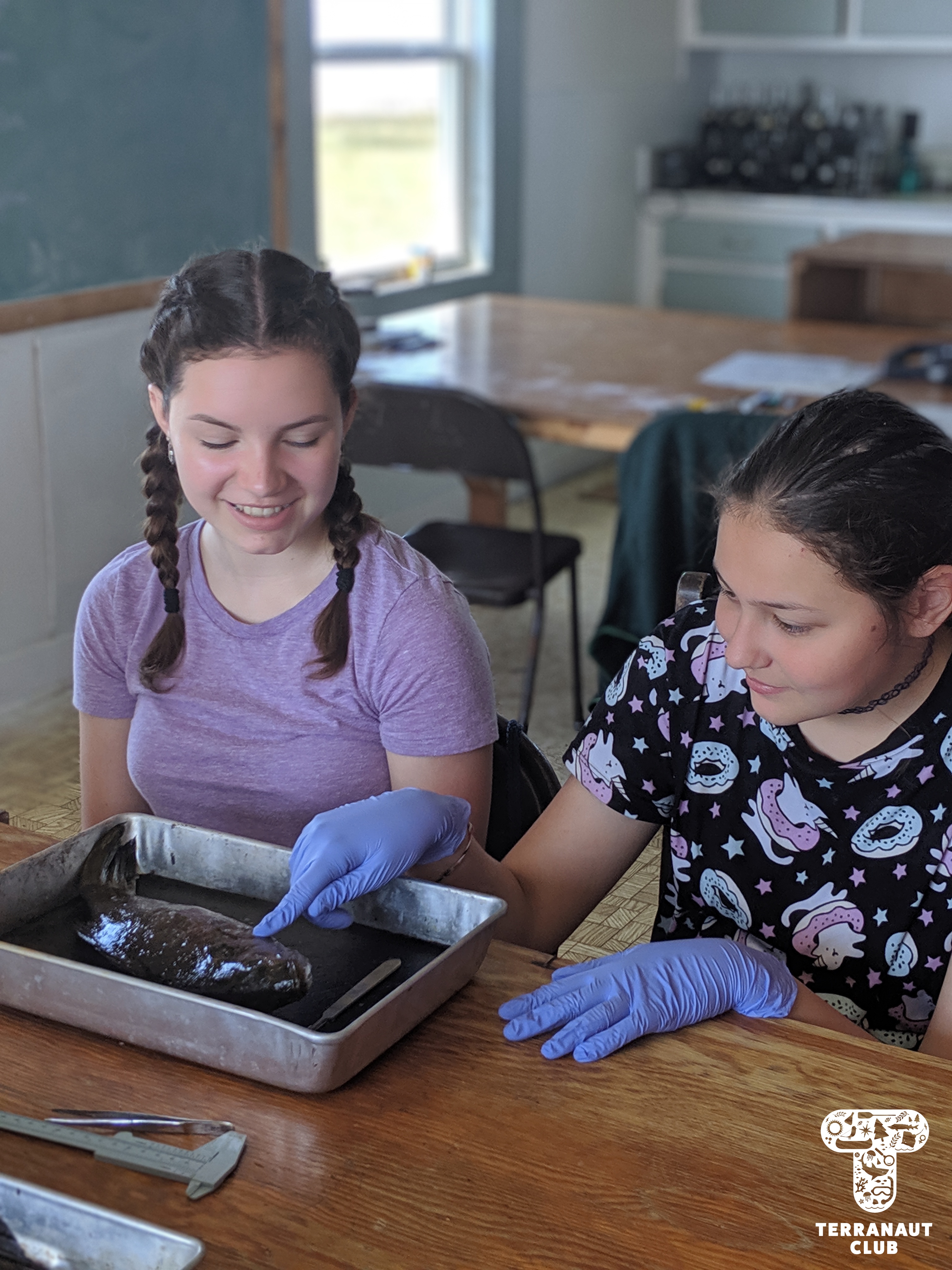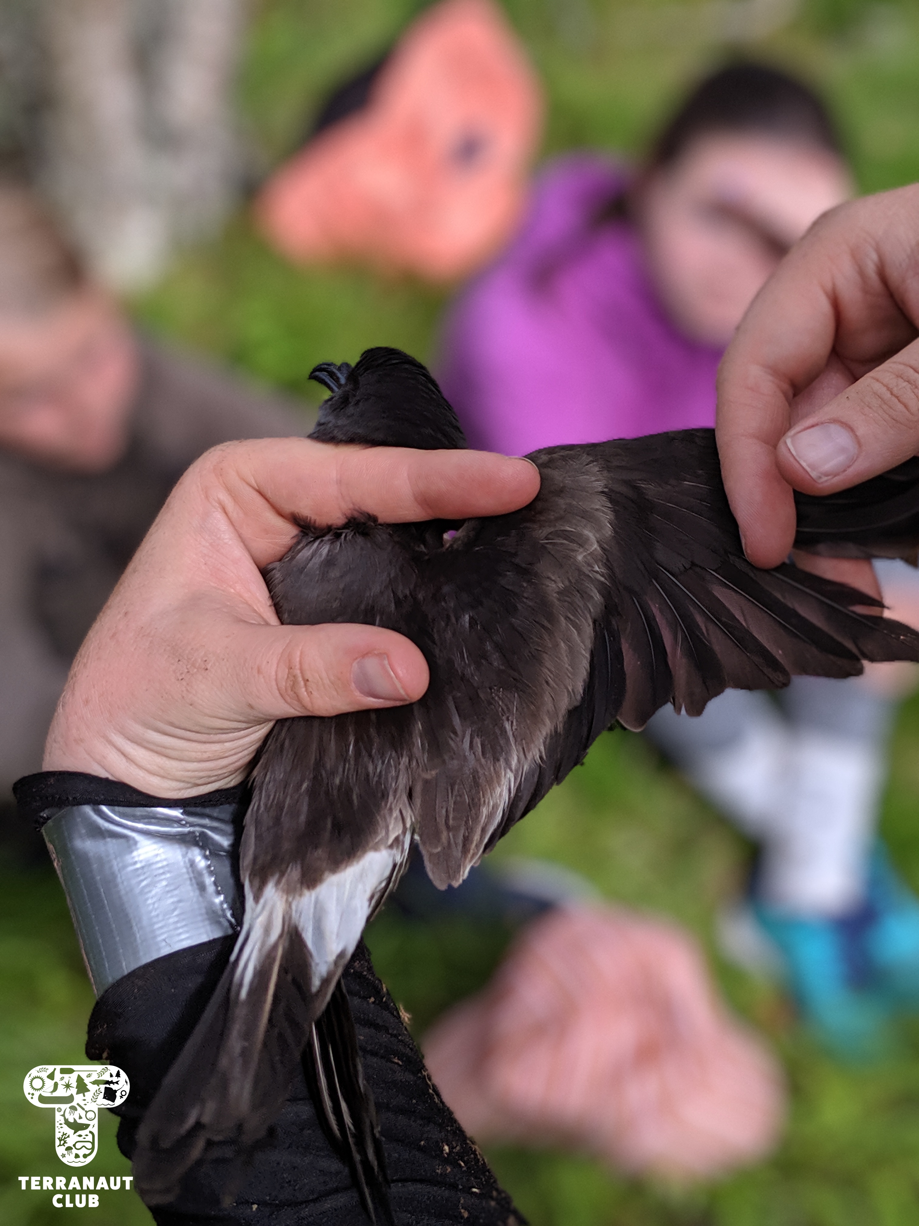 On day 2, our girls got to work in teams to identify the Island’s mysterious washed-up whale bones (later identified as a Humpback whale), do a dissection of invasive small-mouth bass caught in the Lunenburg area to see what the fish had been eating, and go grubbing for Leach’s storm petrels with Instructor Danielle. We were fortunate to find 2 adult petrels that all of our participants got to see, and it gave them a great refresher before assisting Island Biologist Rielle (from Acadia University) with her Leach’s storm petrel research the next day. During this research on day 3, our participants got to watch Rielle, with assistants Safyah and Nina, grub for petrels in designated nests. “Grubbing” involves reaching your arm down a nest in the ground to find and gently remove the adult bird, egg, or chick, for research purposes. Rielle was grubbing these specific nests to try and find the birds that they had attached GPS tags to about 3 weeks earlier. These tags track foraging trips (which can be several hundreds of kilometres!), but the GPS data collected has to be physically downloaded from the tag, meaning we don’t learn anything until the birds are found again and the tags removed. After finding 3 of the 8 birds they were looking for and removing their tags, Rielle and assistants also collected a sample of their blood and feathers. The blood sample will be used to learn about how much mercury the birds are getting from their diet, and the feather sample if they acquired it overwinter. All of these activities we conducted under special scientific research licenses and permits, and the petrels were safely released back into their nests after sampling.