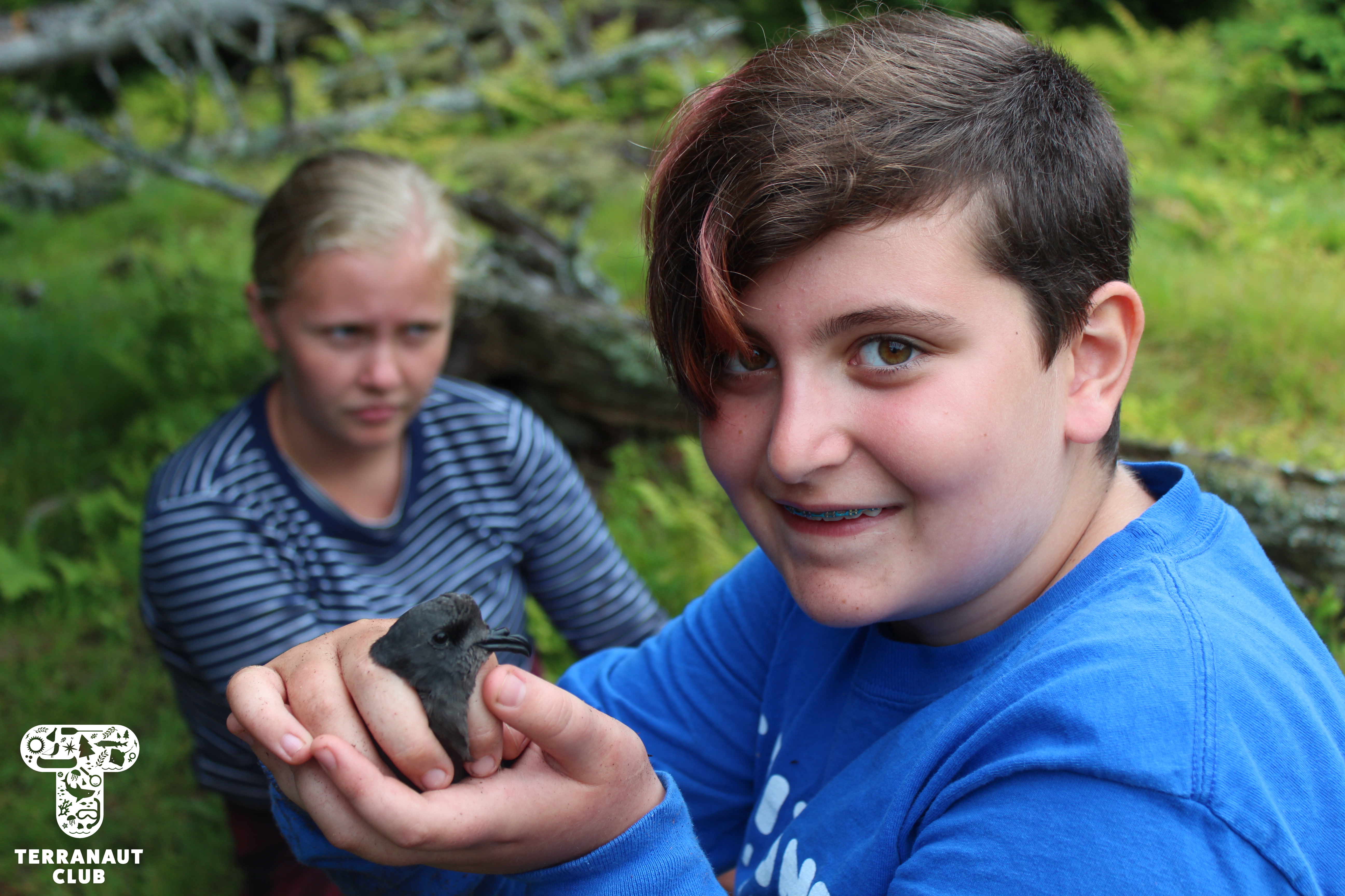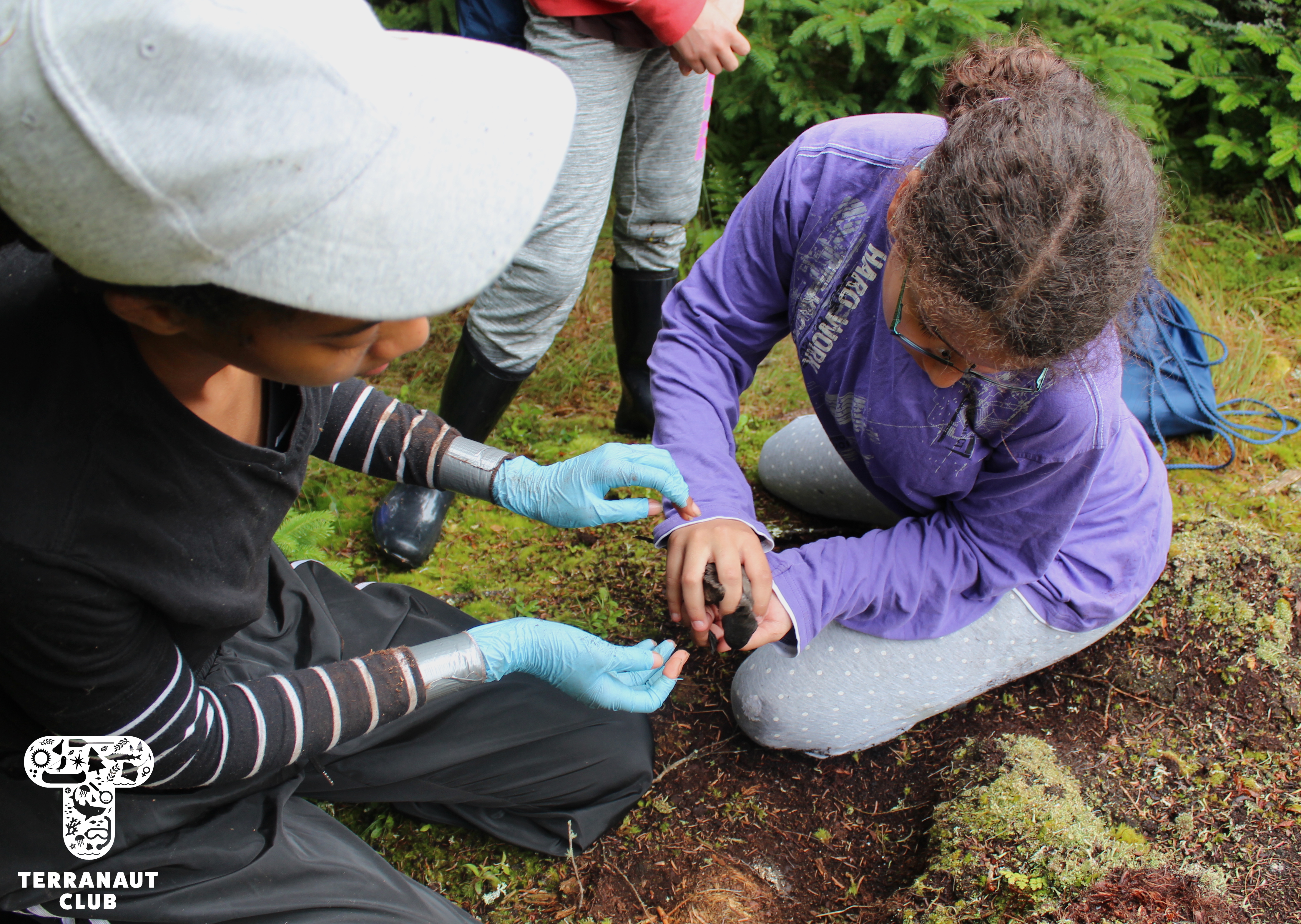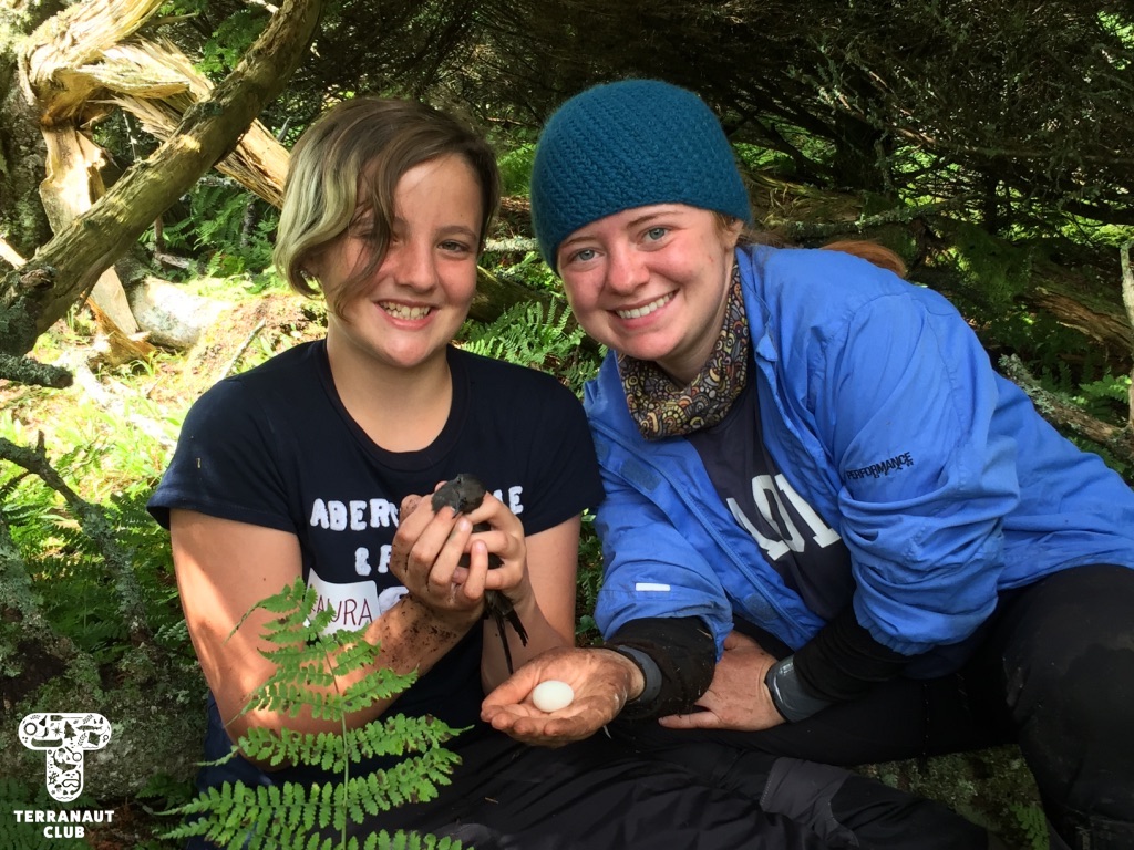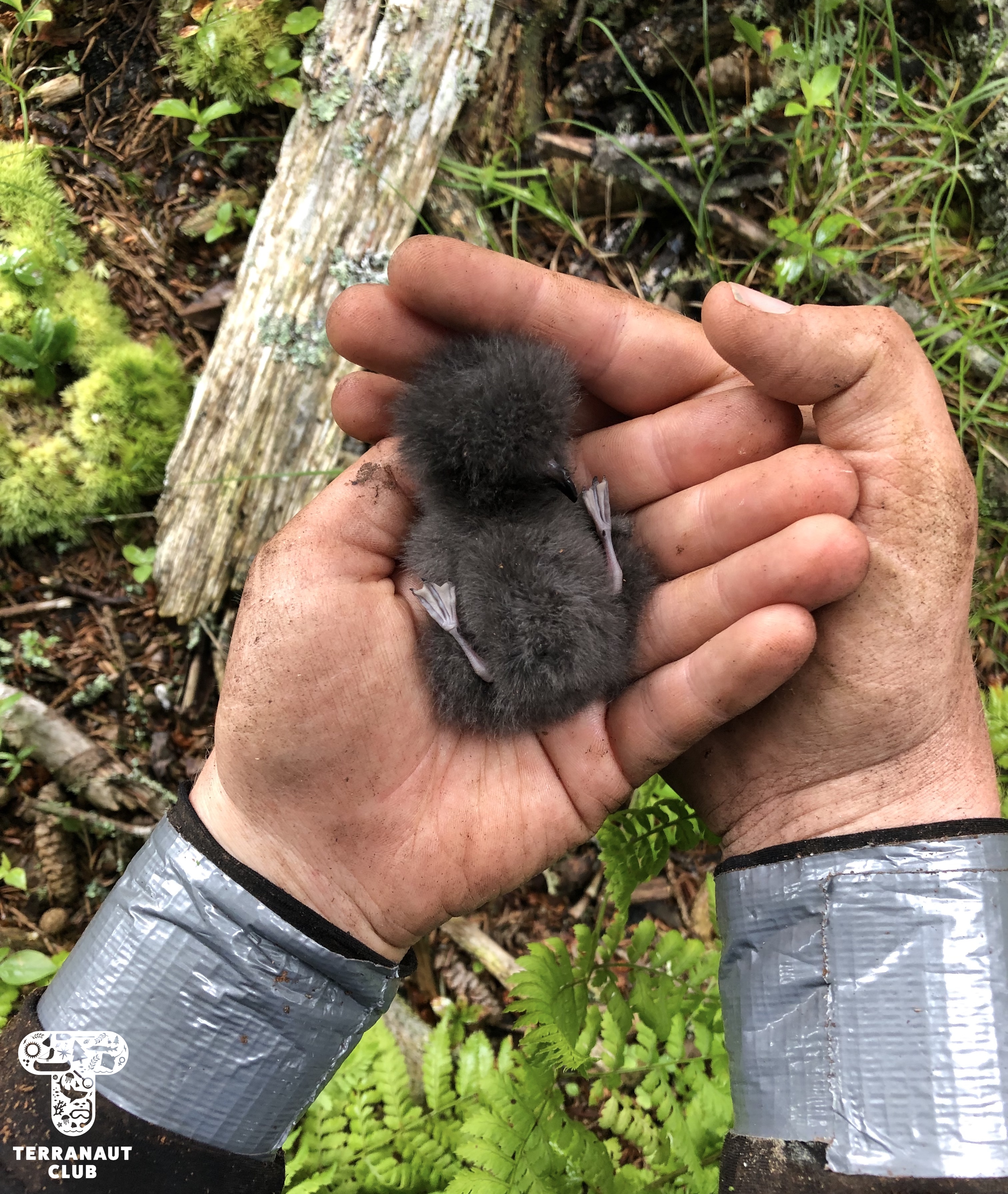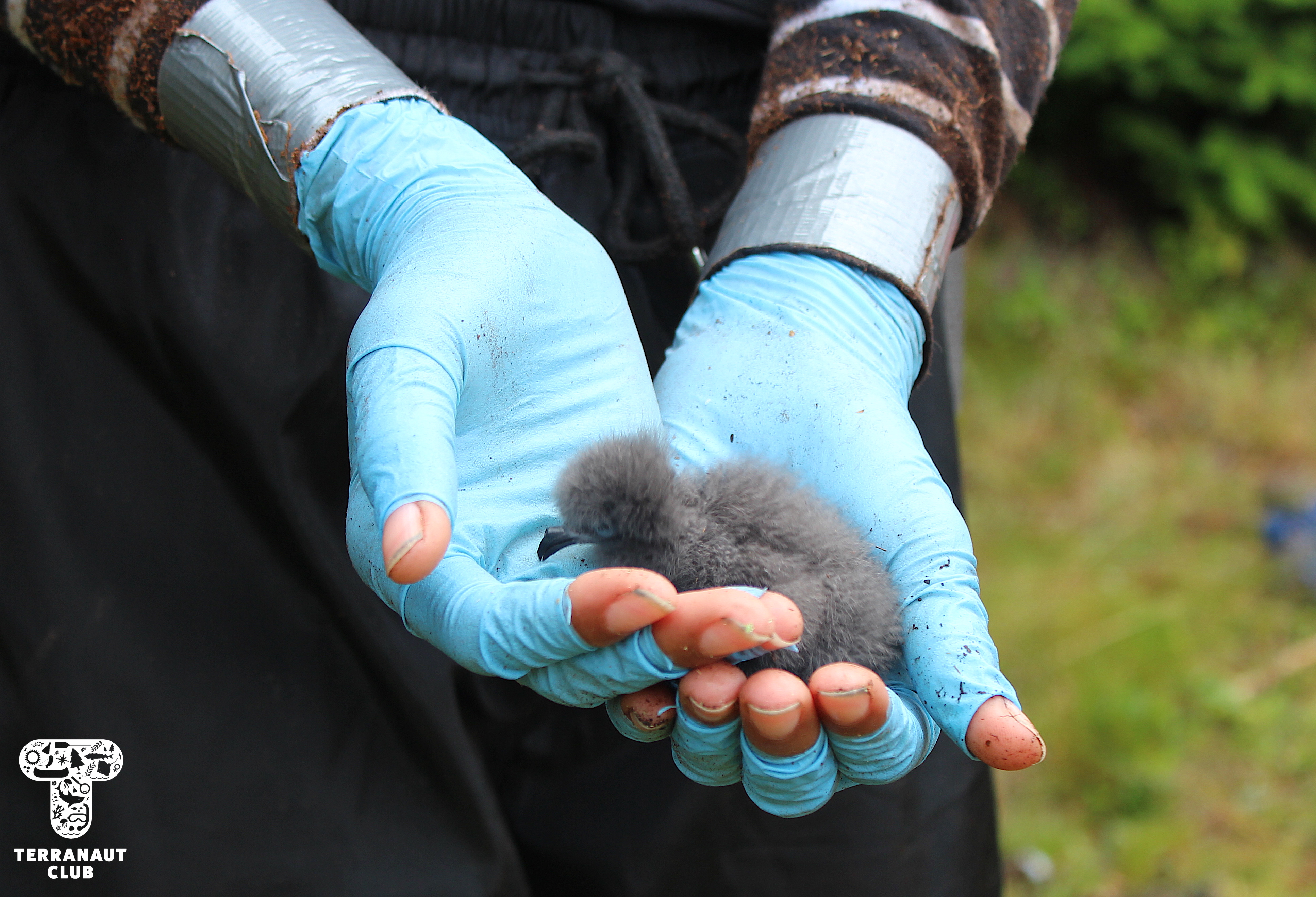 The following morning, we embarked on a hike across the Island with resident Biologists Rielle, Safyah, and Nina to assist them with their Leachβs storm petrel (Oceanodroma leucorhoa) conservation research. Leachβs storm petrel is a small grey species of seabird that has been assessed as βvulnerableβ by the International Union on the Conservation of Nature (IUCN), a group that studies the conservation status of plants and animals around the world. Petrels are nocturnal birds that, during mating season, hunt for fish at sea during the day and return to their nests at night to feed their chicks. There are an estimated 40,000 pairs of Leachβs storm petrel that seasonally inhabit Bon Portage, and the conservation of this colony makes up the majority of wildlife research on the Island. Our participants were able to interact with these incredible animals by helping Island Biologists with their research projects, including helping Safyah identify new nests with chicks in them that she would later collect blood and feather samples from to test the mercury levels. But since Leachβs storm petrels nest in burrows, to find them you have to stick your arm into holes in the ground in an act called βgrubbingβ! (Since there are no natural predators on the Island that could fit into these burrows, thereβs no chance that there will be anything else in the nest, making it a safer activity than it may sound like.) We were amazingly lucky during this morning of grubbing to find 9 chicks and 6 adults. Some of these chicks were only days old, and closely resemble grey pom-poms with legs. You can imagine how excited we were to get to interact with such adorable animals!