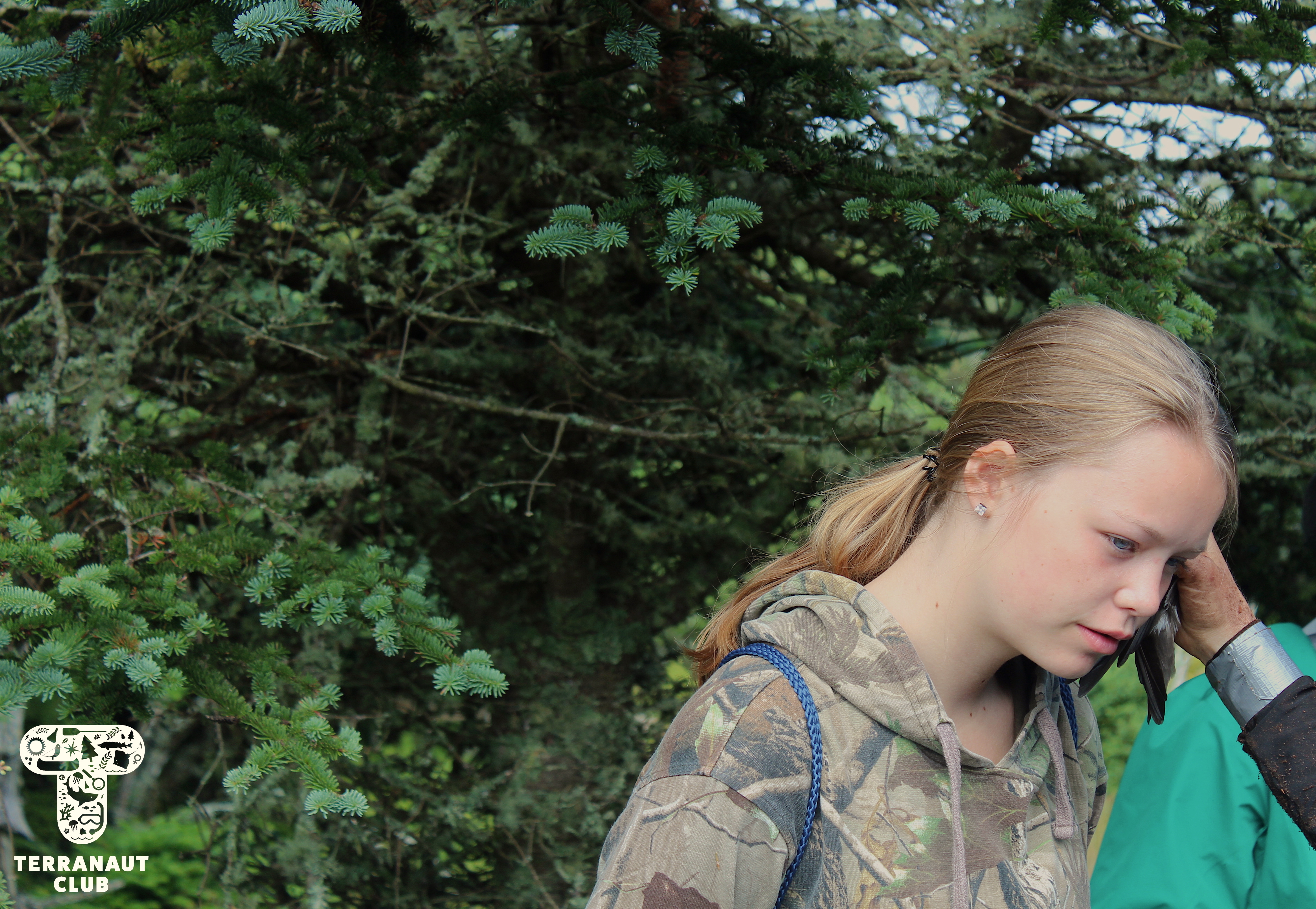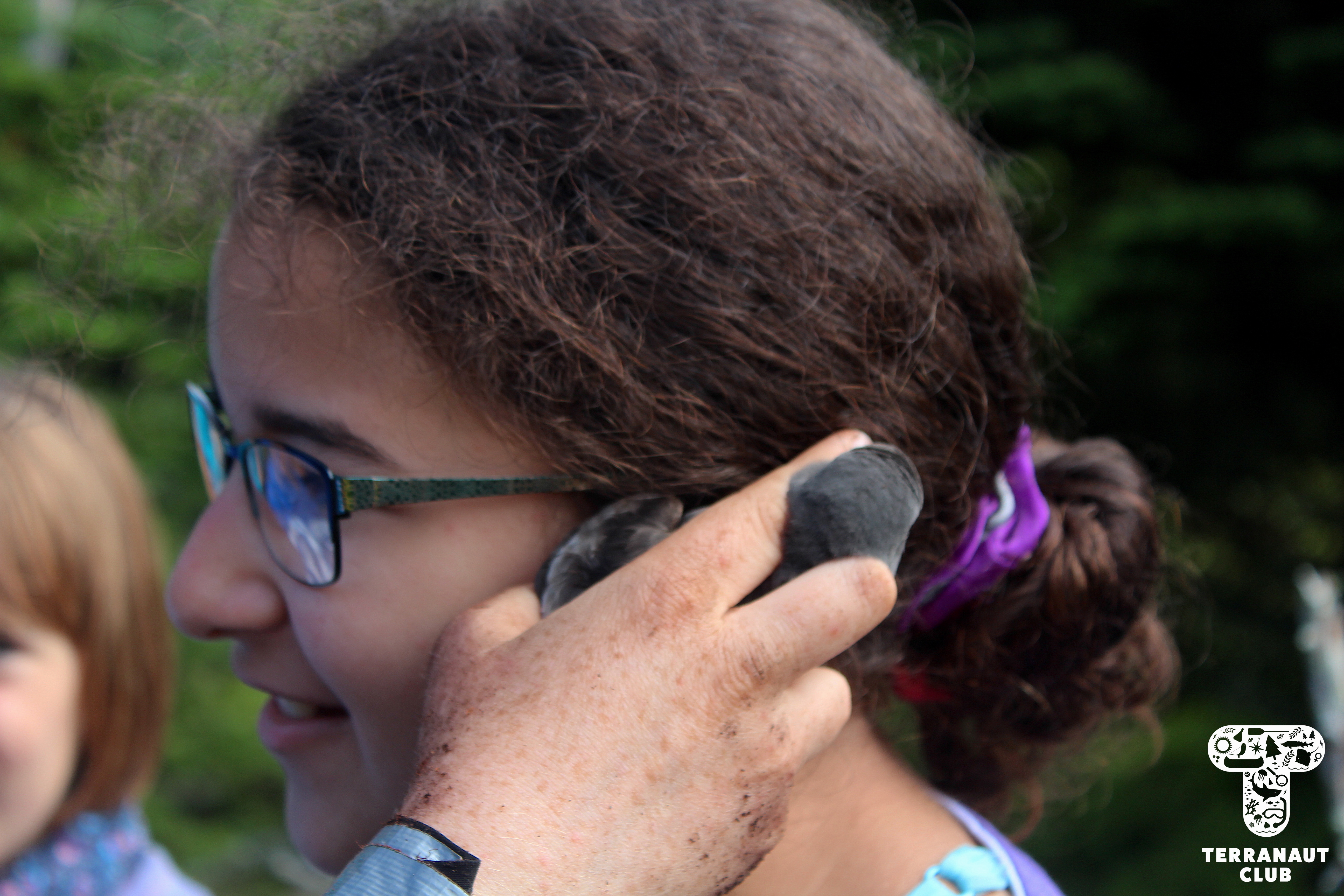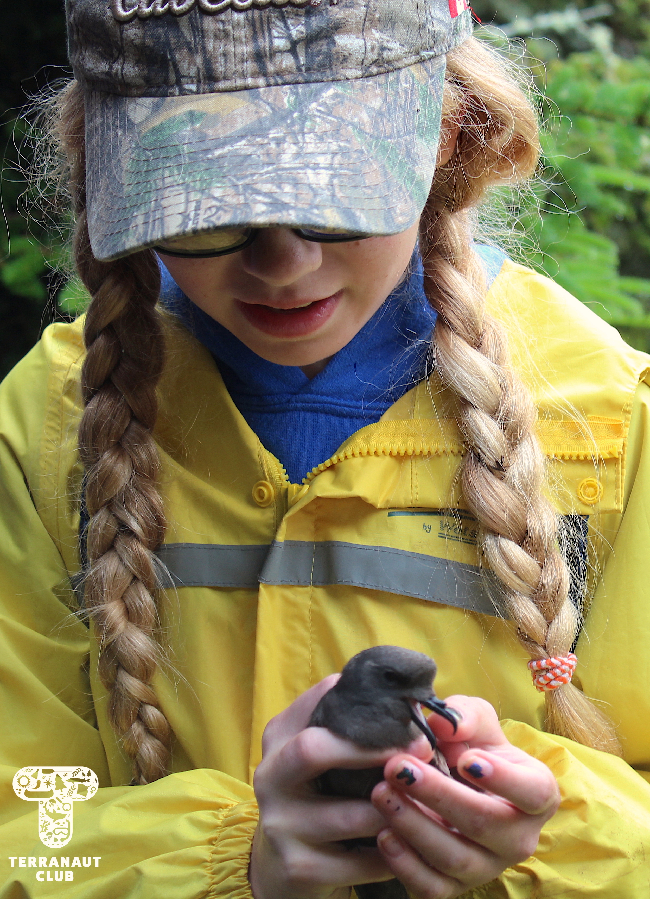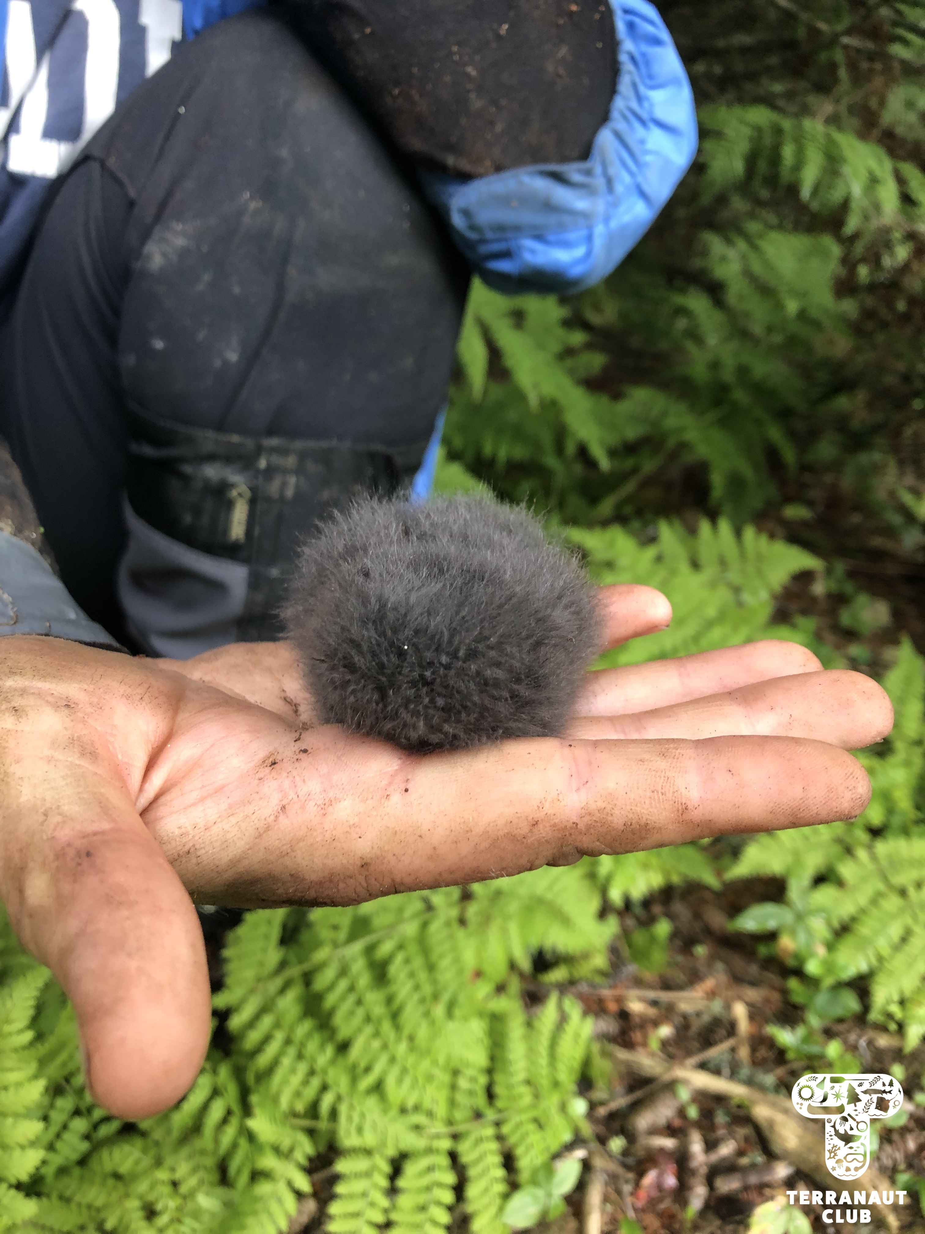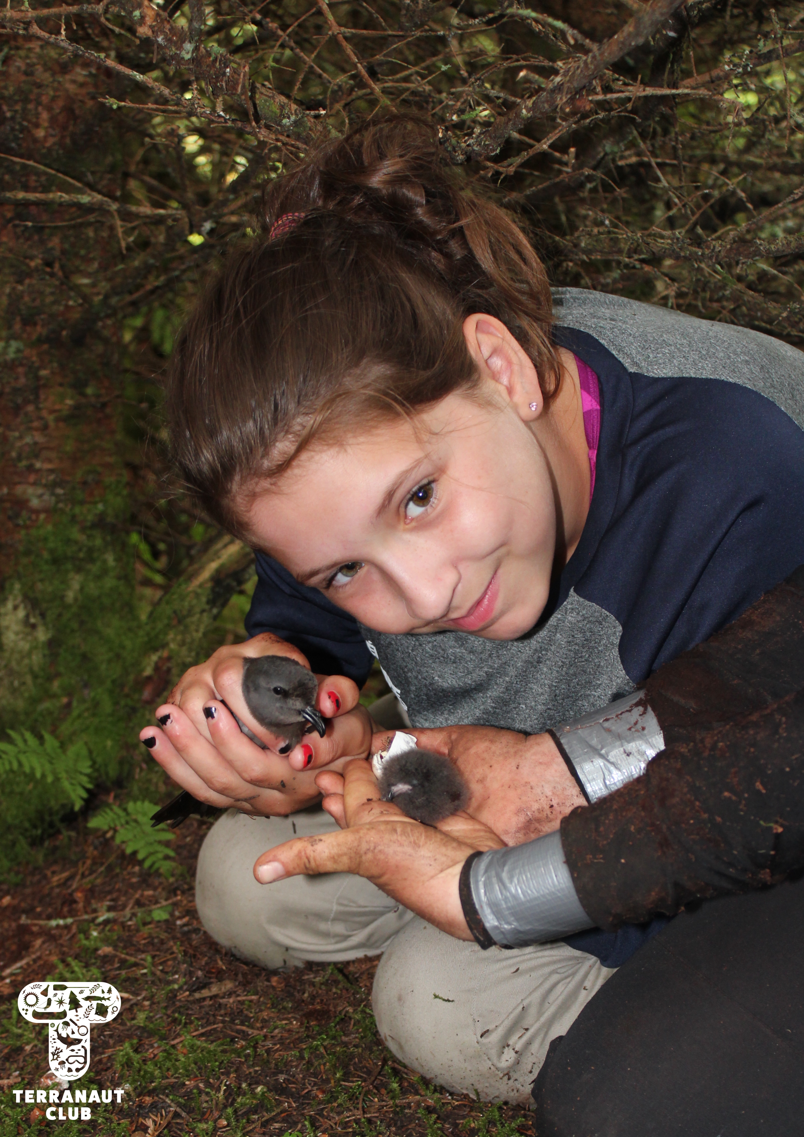 The following morning, we embarked on a hike across the Island with resident Biologists Rielle, Safyah, and Nina to assist them with their Leachβs storm petrel (Oceanodroma leucorhoa) conservation research. Leachβs storm petrel is a small grey species of seabird that has been assessed as βvulnerableβ by the International Union on the Conservation of Nature (IUCN), a group that studies the conservation status of plants and animals around the world. Petrels are nocturnal birds that, during mating season, hunt for fish at sea during the day and return to their nests at night to feed their chicks. There are an estimated 40,000 pairs of Leachβs storm petrel that seasonally inhabit Bon Portage, and the conservation of this colony makes up the majority of wildlife research on the Island. Our participants were able to interact with these incredible animals by helping Island Biologists with their research projects, including helping Safyah identify new nests with chicks in them that she would later collect blood and feather samples from to test the mercury levels. But since Leachβs storm petrels nest in burrows, to find them you have to stick your arm into holes in the ground in an act called βgrubbingβ! (Since there are no natural predators on the Island that could fit into these burrows, thereβs no chance that there will be anything else in the nest, making it a safer activity than it may sound like.) We were amazingly lucky during this morning of grubbing to find 9 chicks and 6 adults. Some of these chicks were only days old, and closely resemble grey pom-poms with legs. You can imagine how excited we were to get to interact with such adorable animals!