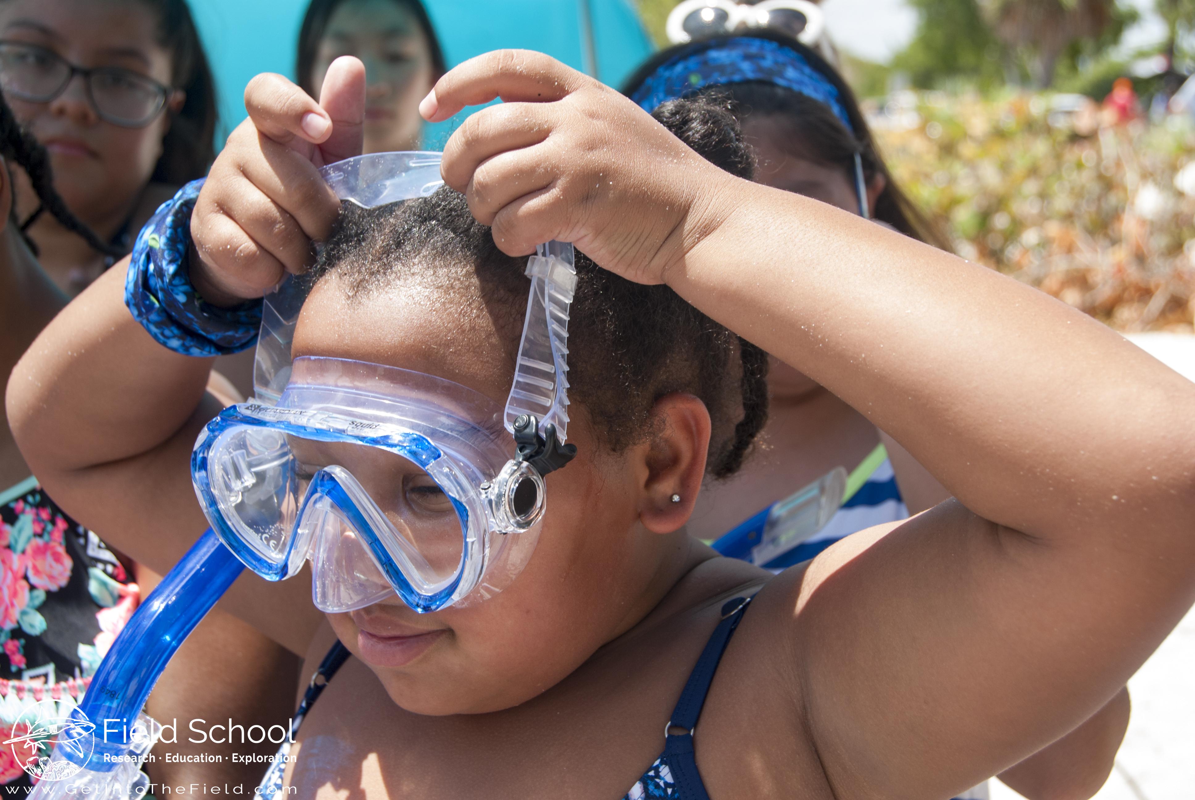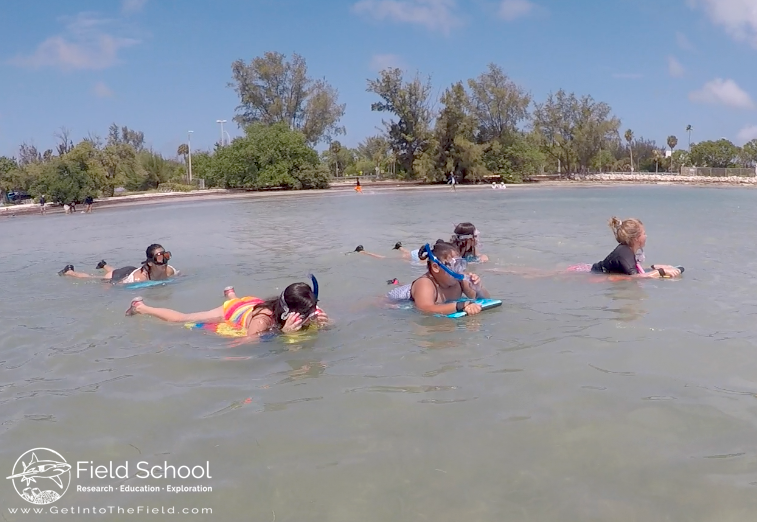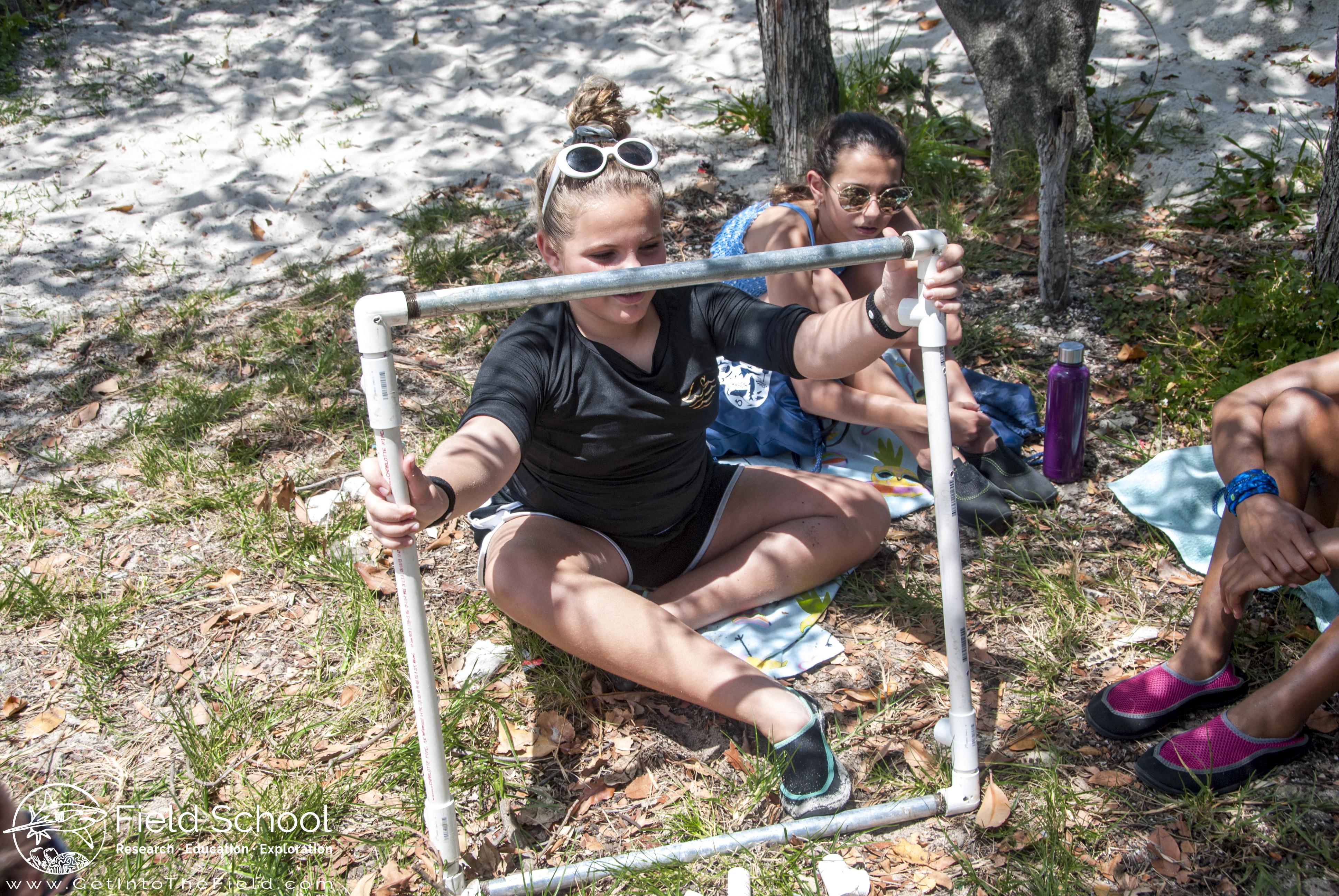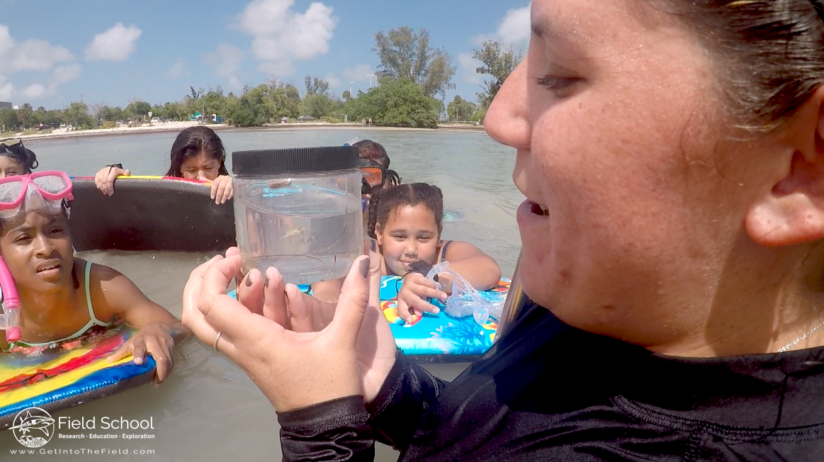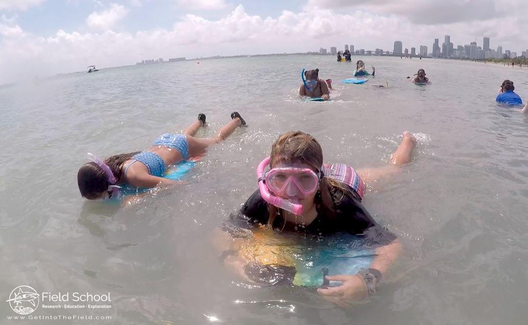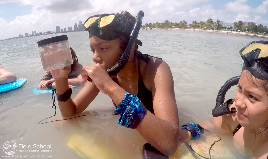 After our participants had arrived and sorted their things into Field Schoolโs R/V Garvinโs bunks (our home for the weekend), we headed to Hobie Beach across the causeway on Virginia Key. We started off by splitting into teams designated by patterned Waterlust headbands, which are made from recycled pre-consumer waste and fabric scraps. These 3 teams were: Team Cosmic Coral, Team Abalone, and Team Sun-Kissed Sea. We worked in these teams to first design and then build BRUVs, or Baited Remote Underwater Video Systems, that would passively record the plant and animal community of Hobie Beachโs seagrass bed ecosystem. The girls named these impressive structures โPatricia 0.5โ and โUnigoโ, and we filled their bait cages with delicious, slimy, and smelly mashed Menhaiden bait before we deployed them in the shallow seagrass beds for a few hours. After completing our BRUV engineering activity, we geared up with snorkels, masks and body boards to survey the seagrass ecosystem with our own eyes. The body boards were useful to keep our feet off the seagrass and the water clear. Since one of the functions of seagrass is to trap sediment, shuffling around it stirs everything up and reduces the visibility in the water to pretty much nothing! While we were enjoying our snorkeling adventure, Field School Director Dr. Catherine Macdonald and interns Kylie and Marissa pulled a seine net through the water to catch small creatures living in the seagrass. Despite us not seeing much other than swaying seagrass meadows during our snorkeling, seining seemed to catch everything that we couldnโt see! We put our catches into small jars and passed them around so everyone could get a good look while Kylie and Marissa taught us all about the incredible creatures. These finds included:
