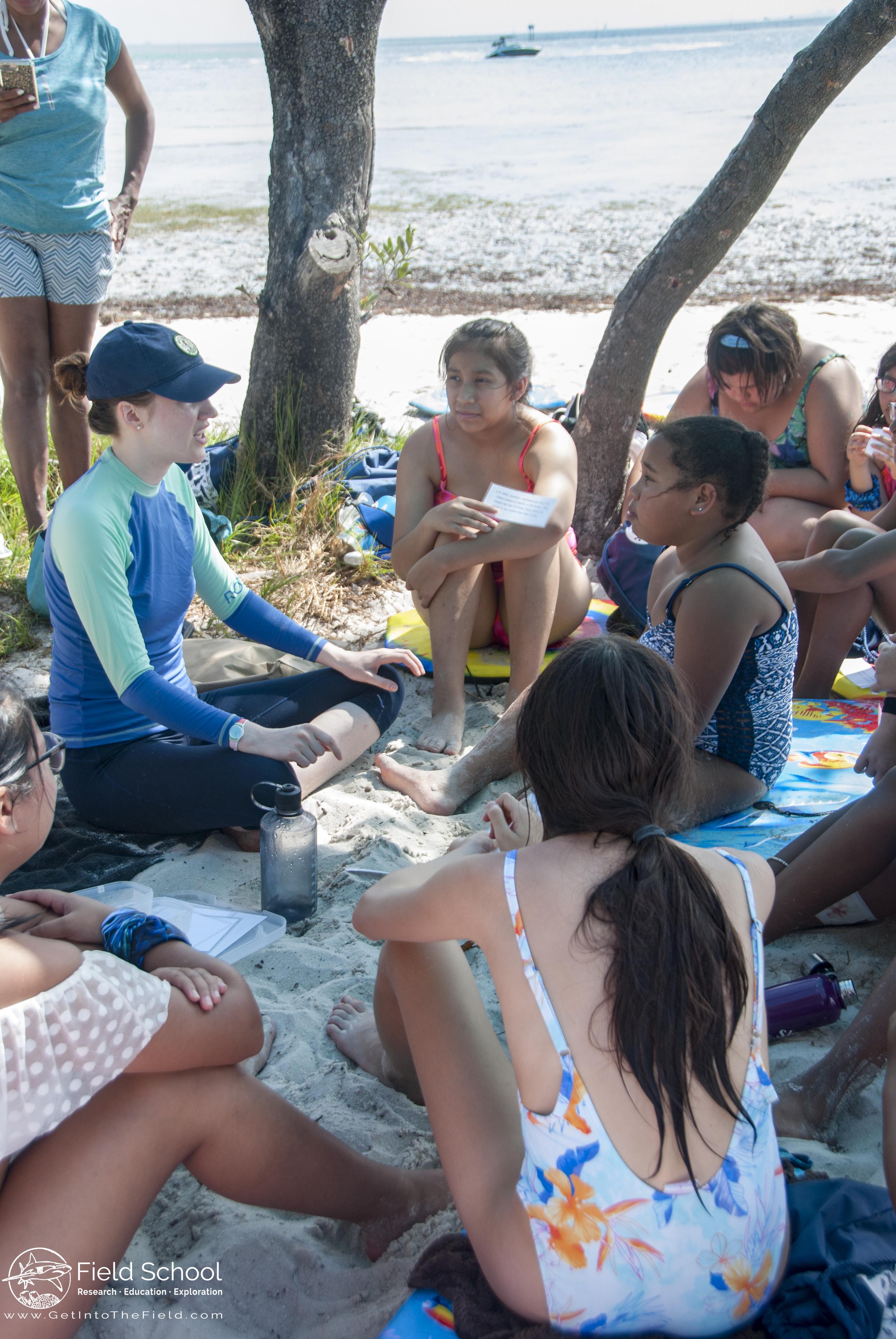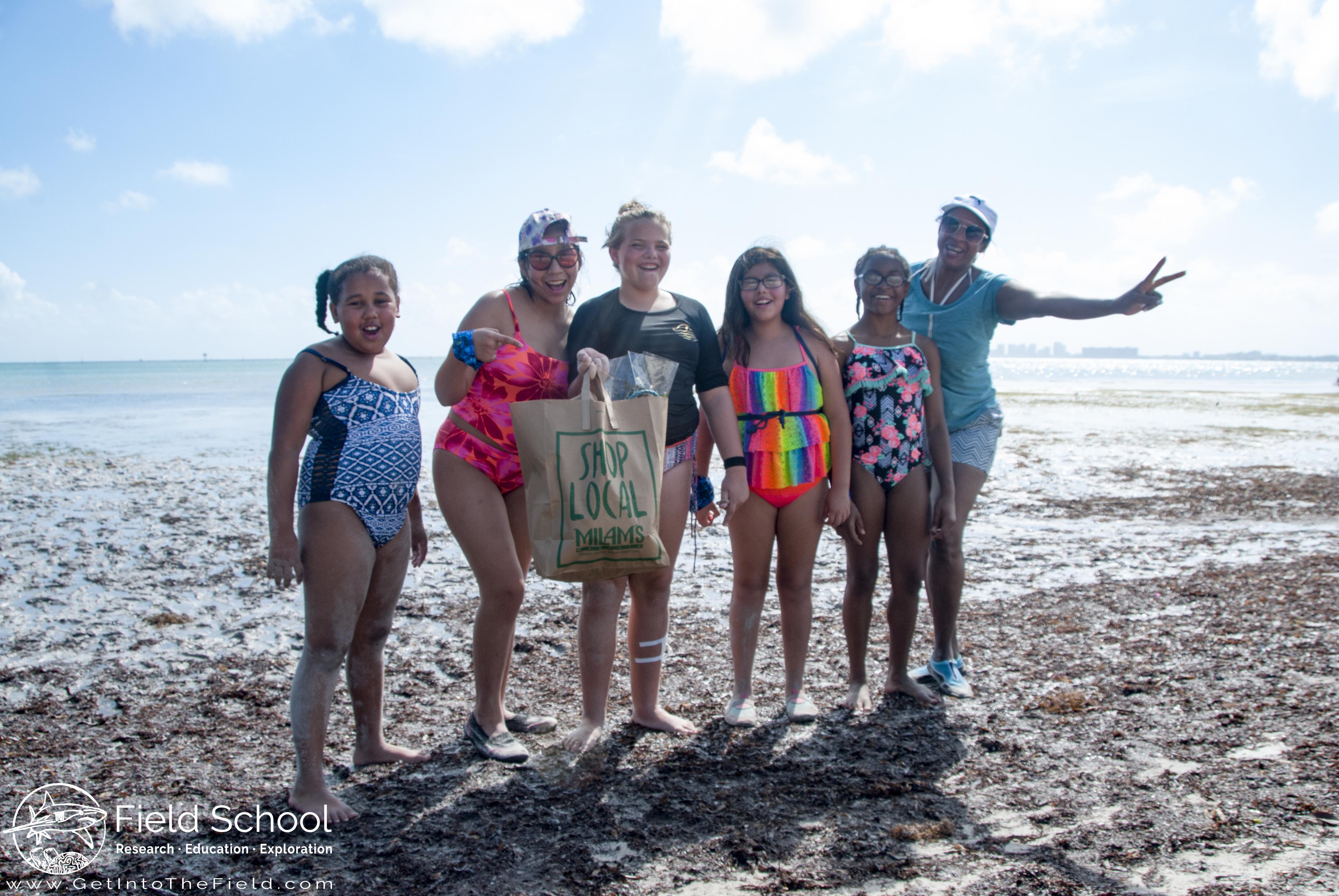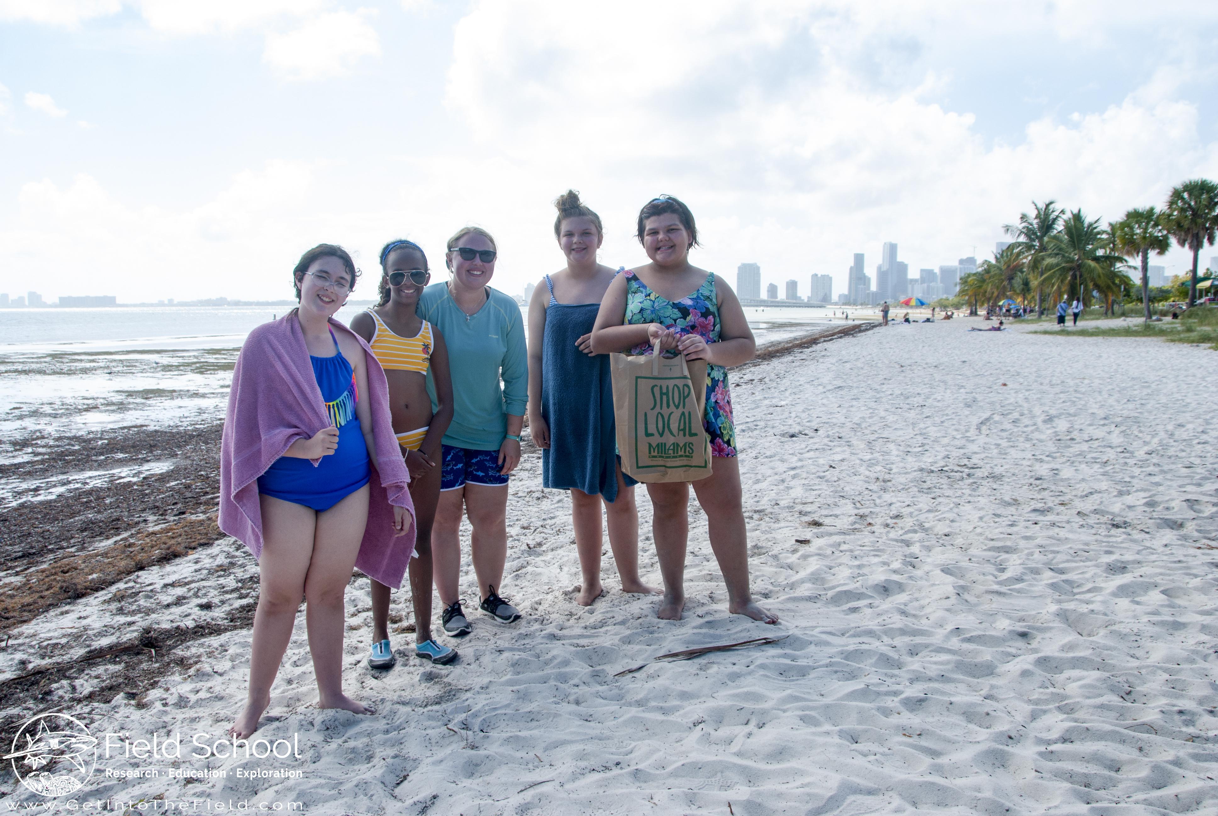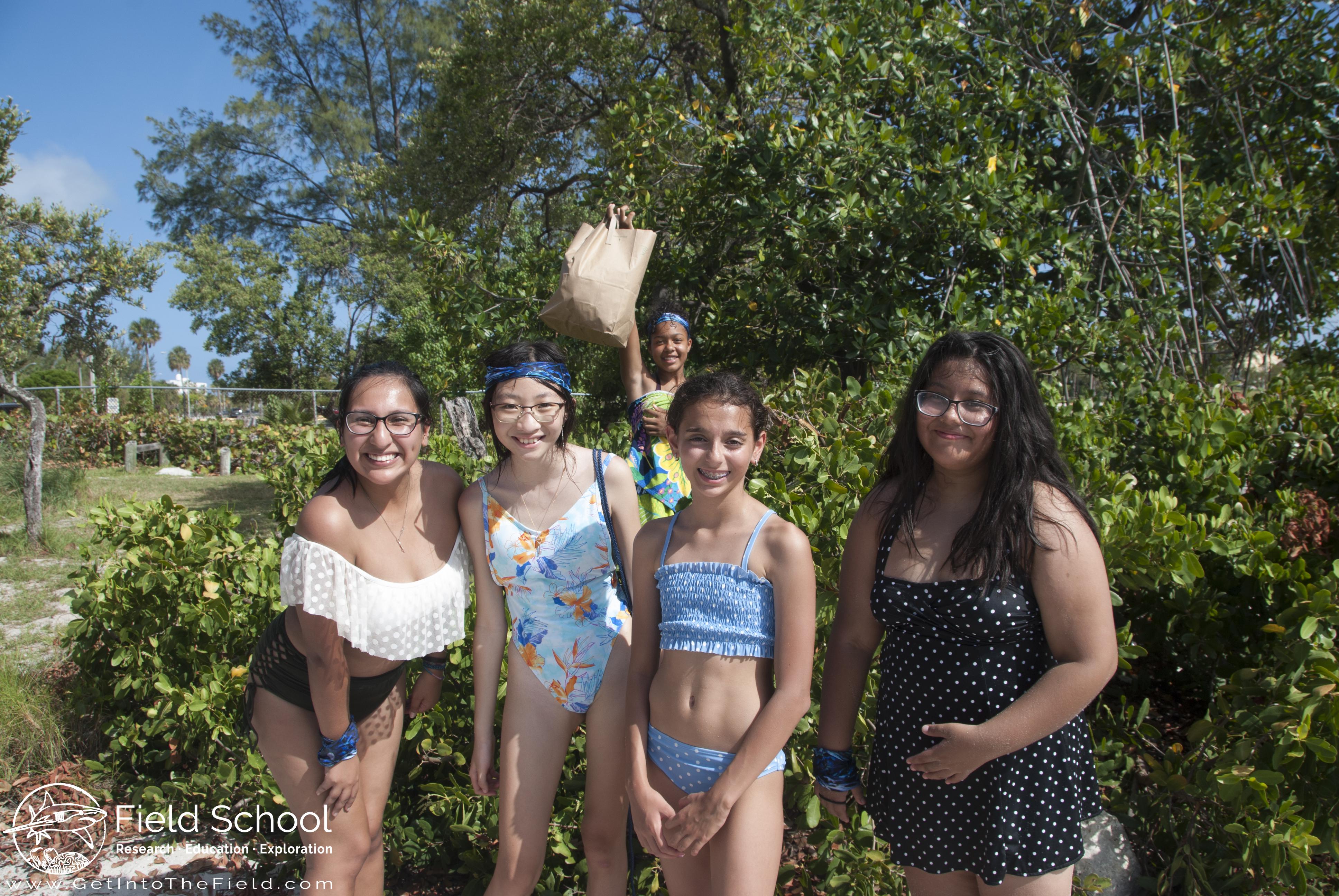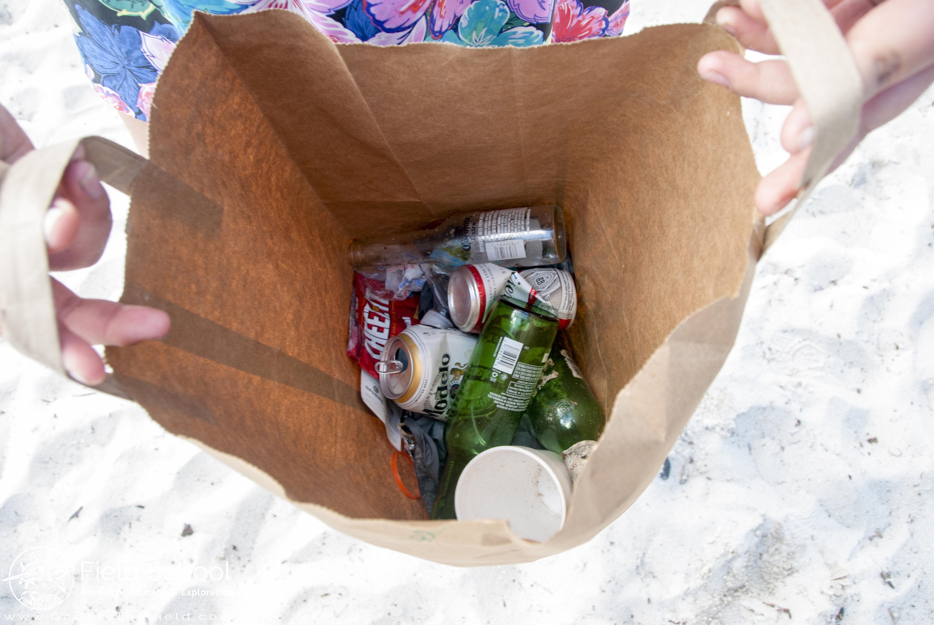After our snorkeling and seining adventure, we headed back to shore to dry off and learn about a major issue in the environmental crisis: marine pollution. Each participant was given one fact to read aloud to the group, and had to follow it up with how it made them feel. Some of the facts included: (1) Over 90% of all seabirds have plastic in their stomachs; (2) Miami disposes of 700,000 straws per day; (3) By 2050, there will be more plastic in the ocean than fish by weight; (4) 1 in 3 species of marine mammal have been found entangled in marine litter; and (5) Over the last ten years we have produced more plastic than during the whole of the last century. Unsurprisingly, all of our participants reported feeling depressed, sad, and disgusted by these facts. We followed-up this discussion with a service component: a โflashโ beach clean-up. Our girls worked in their teams to see who could collect the most trash off the beach in our 20-minute time period, and the results wereโฆ depressing, sad, and disgusting. It was all too easy for our participants to fill their paper bags with pieces of trash big and small โ from the beach, from the water, from the bushes, from everywhere they looked.