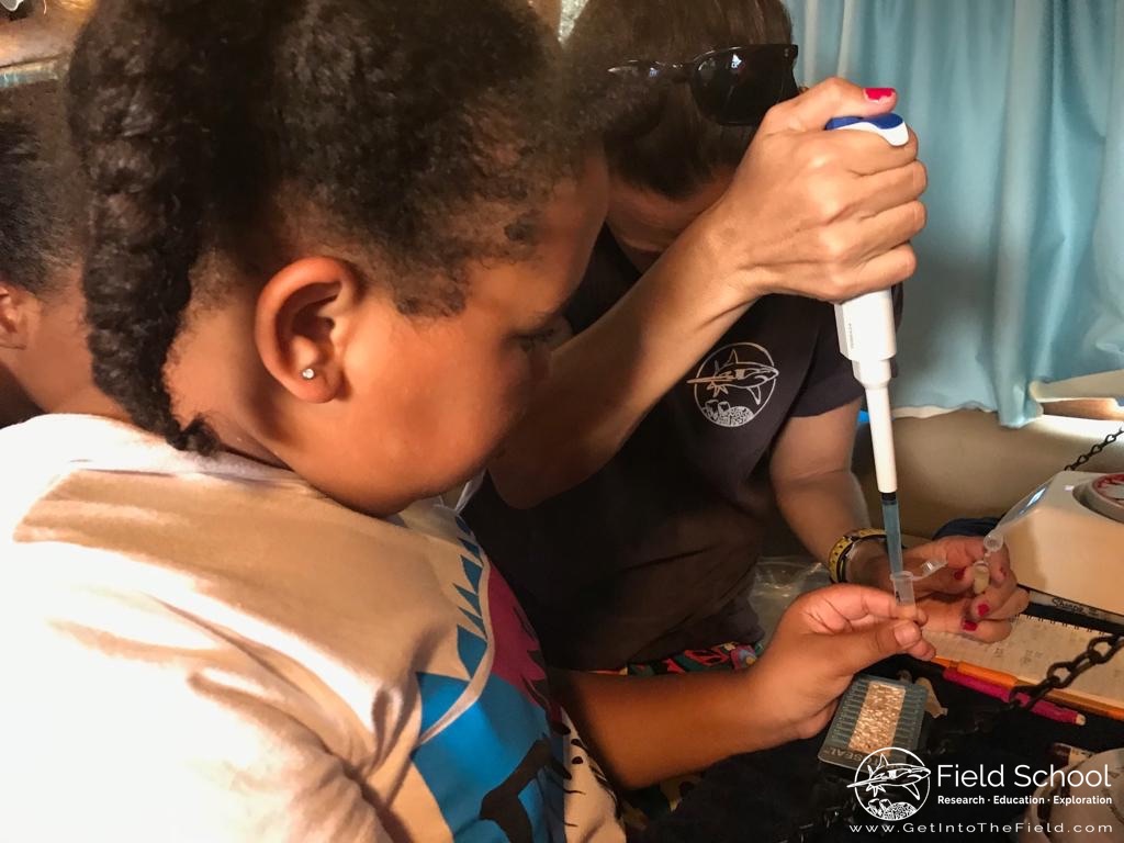 The following morning, we were awake at 7:30am to get prepped before embarking on our day of shark research! But before we could get into the action of it, we had to learn about boat safety and shark safety. While our all-female crew of researchers for the day had an extensive amount of experience working with sharks, it was imperative for everyone on board to understand the risks and how to avoid them. We learned from Field Schoolโs Directors Dr. Catherine Macdonald and Dr. Julia Wester how we would be sampling the sharks once caught, which included measuring 3 different lengths, tagging the shark, taking a tissue sample from the dorsal fin, and testing the sharkโs eye reflexes as an indicator of stress. Dr. Kristine Stump taught us how to set out our fishing gear, complete with big chunks of barracuda as bait, and we got right into it! We set out our first 10 lines and left them to soak for an hour. In the meantime, our participants worked in teams to conduct informal interviews with the 9 women in science that we had on board. These interviews included questions like โwhat was the greatest challenge you faced in getting into your career?โ and โwhatโs the most exciting part of your job?โ By the time weโd finished with this activity, it was time to check our lines! We caught our first shark on the 6th line of our first set, and she was a beautiful 118 cm, full-grown blacknose shark that had previously been tagged by another research team! It was a special experience to get to find a recaptured shark, which highlights the residency of some of these species. Two lines later, we caught a much bigger shark โ a sub-adult female nurse shark that measured in at 200 cm. Fortunately, nurse sharks are very โheartyโ and can withstand extended periods of time out of the water before they become physiologically stressed. While we didnโt push this theory to its limits, we did allow all of our participants to come down to Garvinโs back platform to get to feel the shark before she was released. Our favourite reactions are always the โoh my godโs!โ and โoh, wowโs!โ Sharks are incredible creatures, and itโs a moving experience for us every time that weโre able to facilitate the invaluable connection between humans and wildlife. We set out our next 10 lines and Instructor Marissa showed participants Sloan and Miranda how to sample salinity, or the measure of the oceanโs salt concentration. This process involves an instrument called a โrefractometerโ that is held up to the light to give a reading of salinity. During this break, we also started to practice our bowline knots. For anyone involved in marine science that works on boats, the most important, practical, and versatile knot is the bowline! We decided to turn this into a competition, judged by who could tie a bowline the fastest. After about 20 minutes of practicing and re-practicing, we finally held our competition and Ashley came out victorious at 4.37 seconds! The girls really got into this competition, and ended up being able to tie this knot with their eyes closed and behind their backs! Colour us impressed. For our final set of the day, we flexed our muscles and pulled in 1 โ 6 with no bites. But on the 7th line, we struck gold, pulling in a gorgeous mature female blacktip shark, measuring in at 177 cm! The blacktip shark is different from our previous nurse shark in many ways, but the one we were concerned about most was its stress tolerance. Blacktip sharks are known to be quite sensitive to stress, therefore we had to work even faster than usual to ensure that she was properly sampled before being released back into the ocean in great condition. We pulled in our final 3 lines empty and wrapped up all of our gear for the day, celebrating together that weโd had a phenomenal day on the water with 3 truly spectacular female sharks.