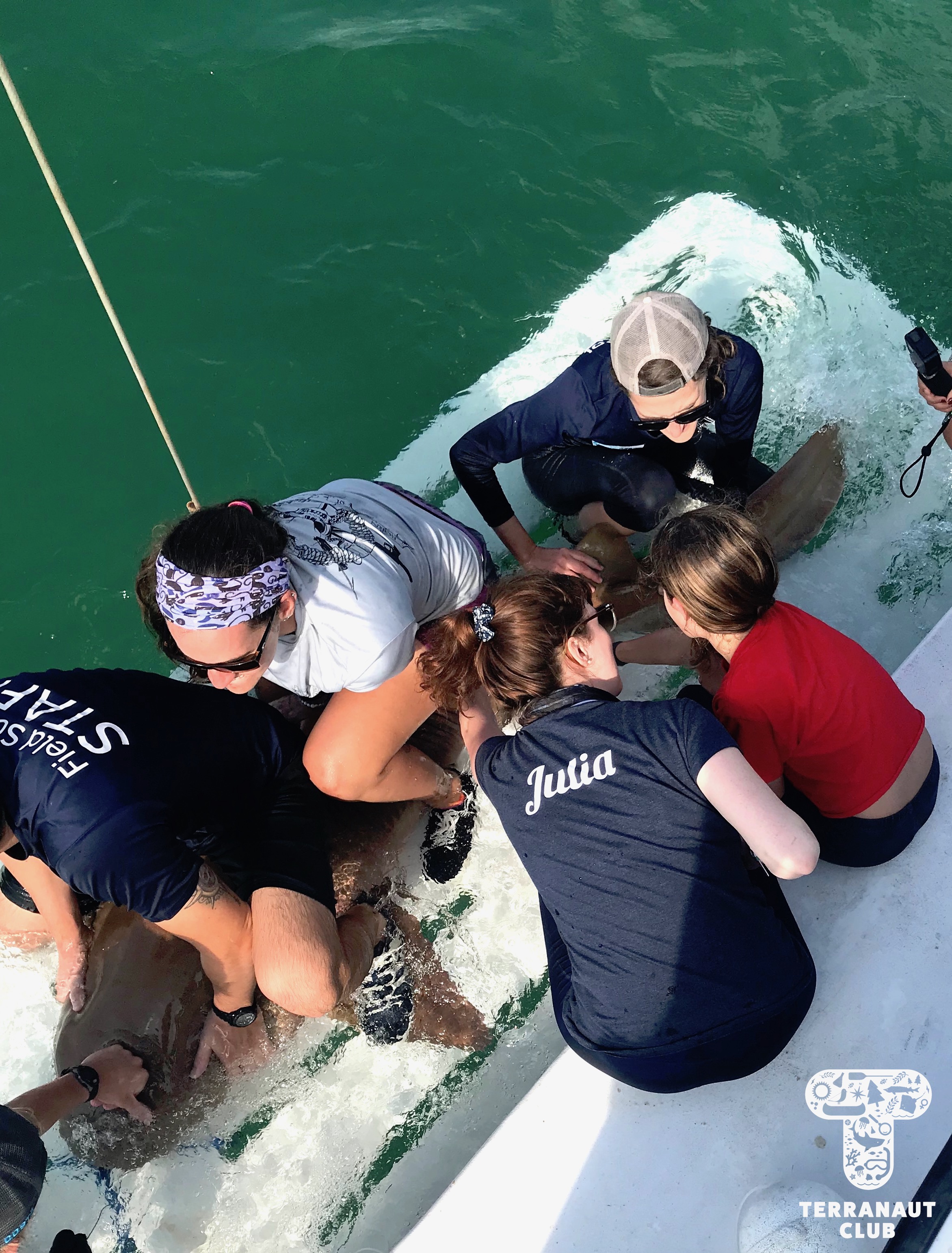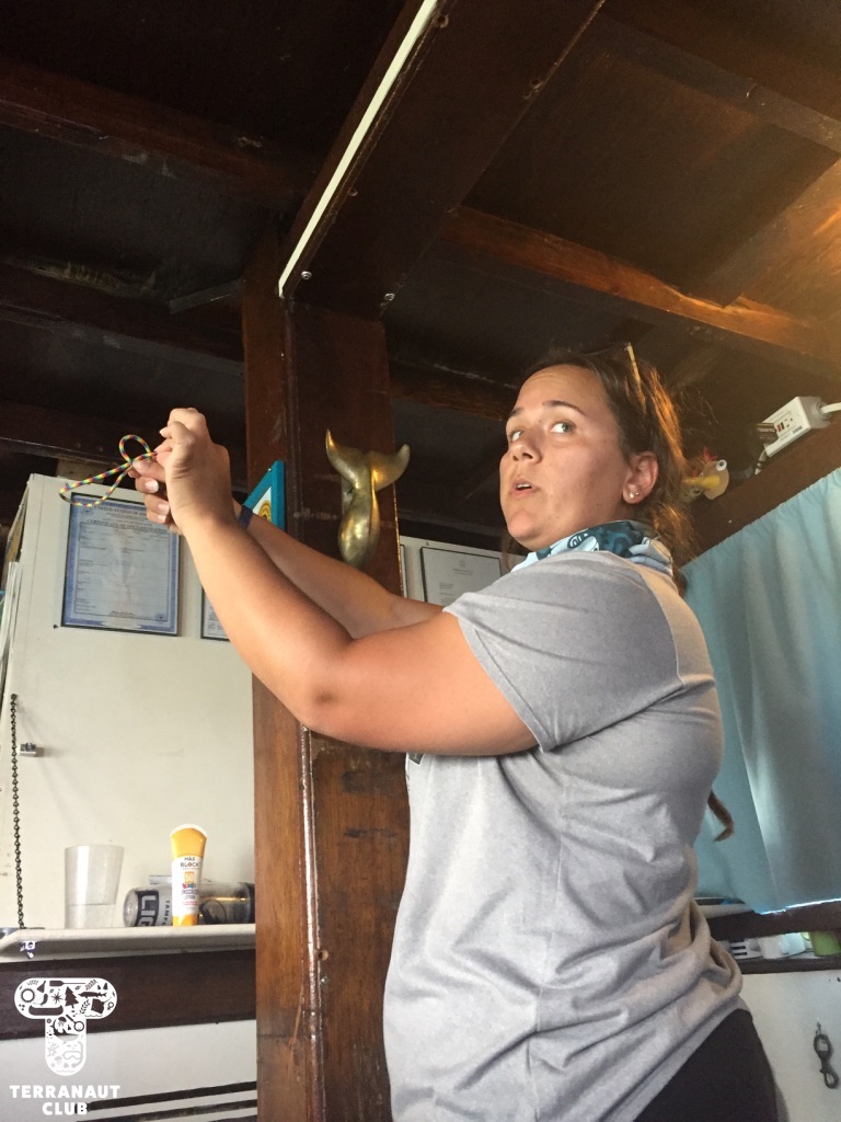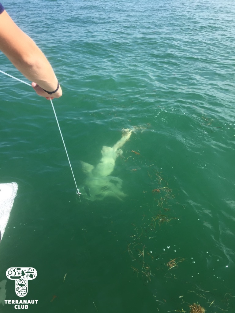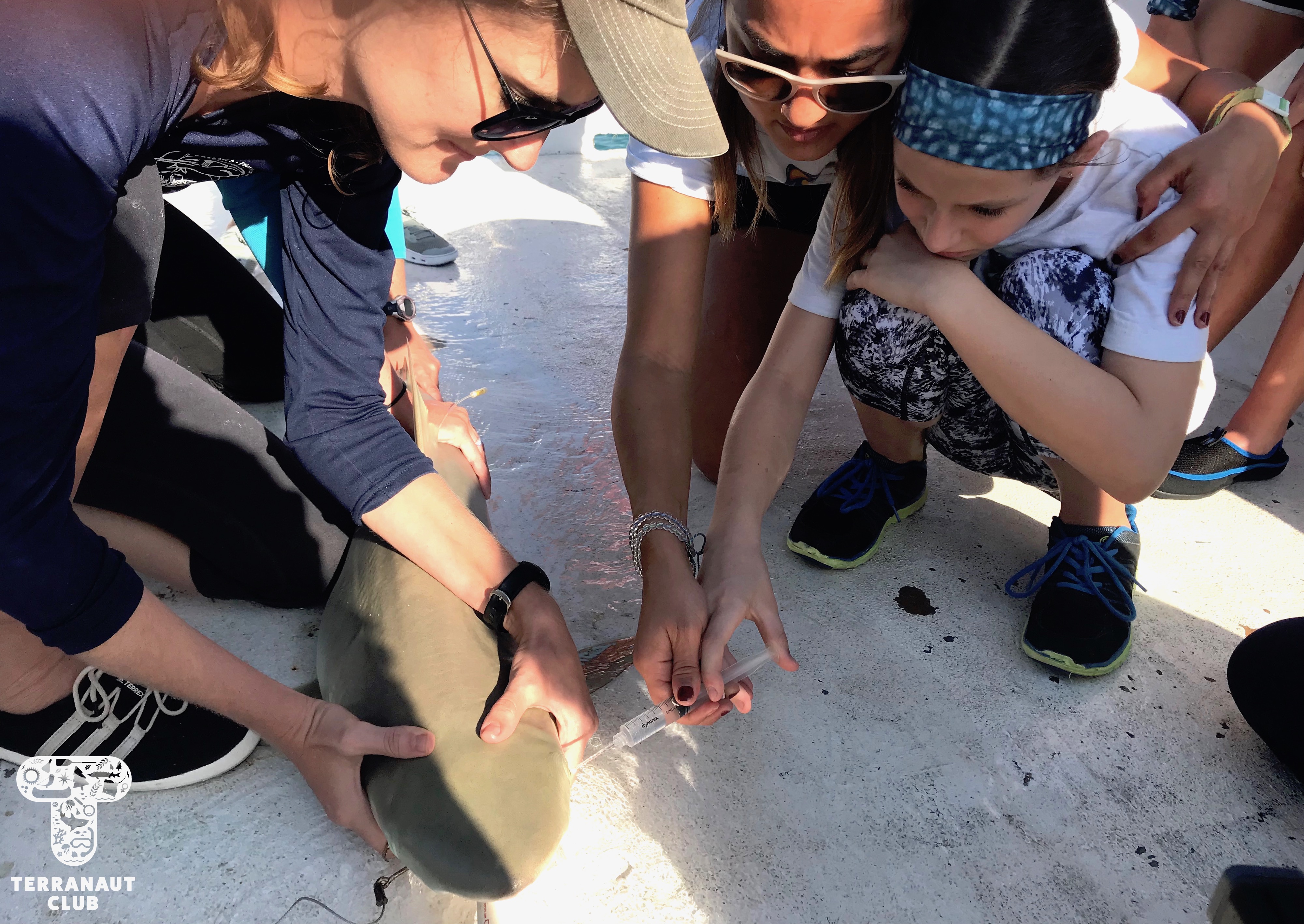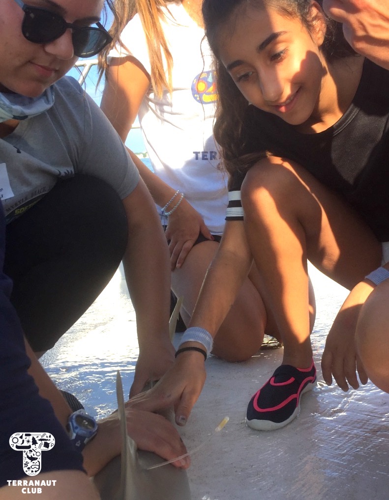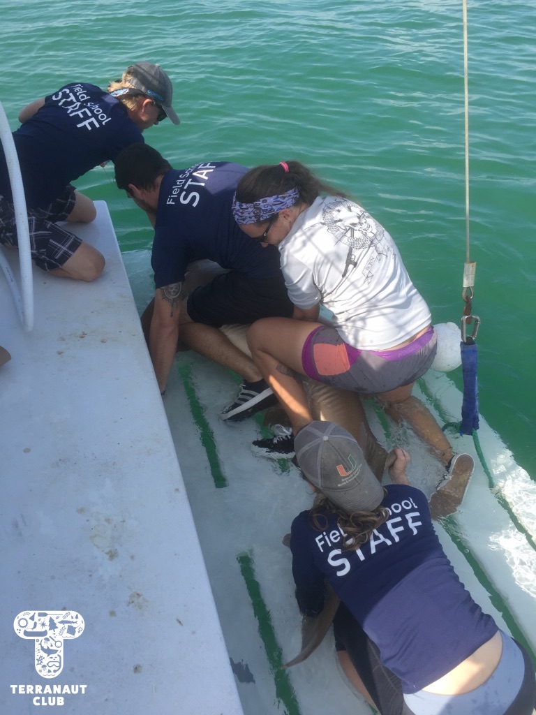 The following morning, we were up early to embark on our day of shark tagging! We set 3 sets of longlines throughout our 7-hour day on the boat, and were fortunate to catch 3 gorgeous sharks! The first was a massive female nurse shark, 2.63 m (~ 8.5 feet) long, that we collected pertinent data from. This included 3 separate length measurements, taking a fin clip, testing its eye nictitating membrane reflexes, and applying a tag under its dorsal fin. Our amazing participants were able to help with every step of this process, and we definitely felt like we’d discovered some budding scientists! In the afternoon, we caught 2 beautiful blacknose sharks on back-to-back lines, one female and one male. Both were just over 1m long, and provided a stimulating contrast to the large nurse shark that we had caught earlier. All of these sharks were safely released back into the ocean within minutes of being brought on-board, and we saw them swim away in great condition!
